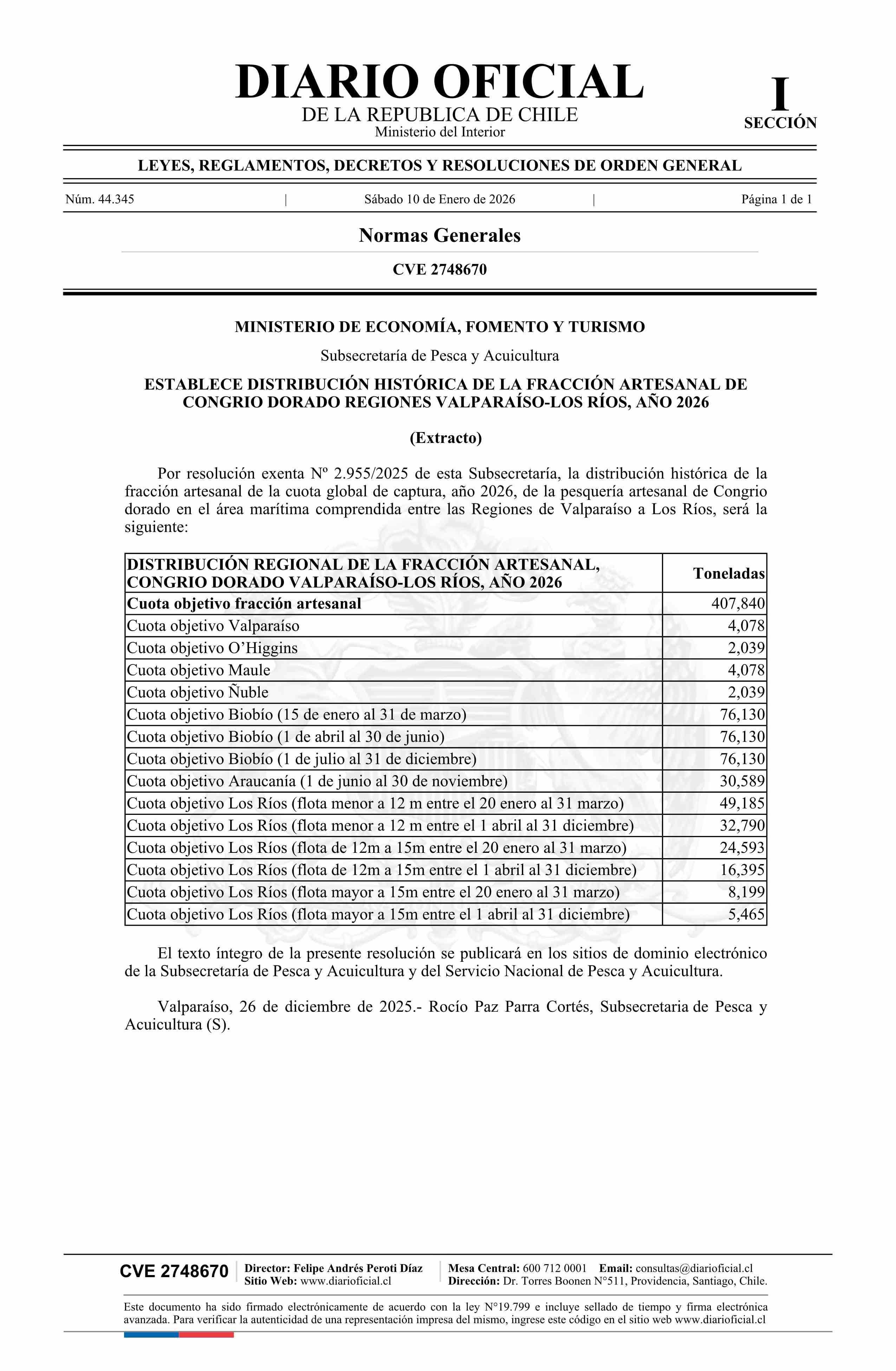 Extracto de resolución exenta número 2.955, de 2025.- Establece distribución histórica de la fracción artesanal de Congrio dorado regiones Valparaíso-Los Ríos, año 2026 10-01-2026 Diario Oficial Edición Electrónica |