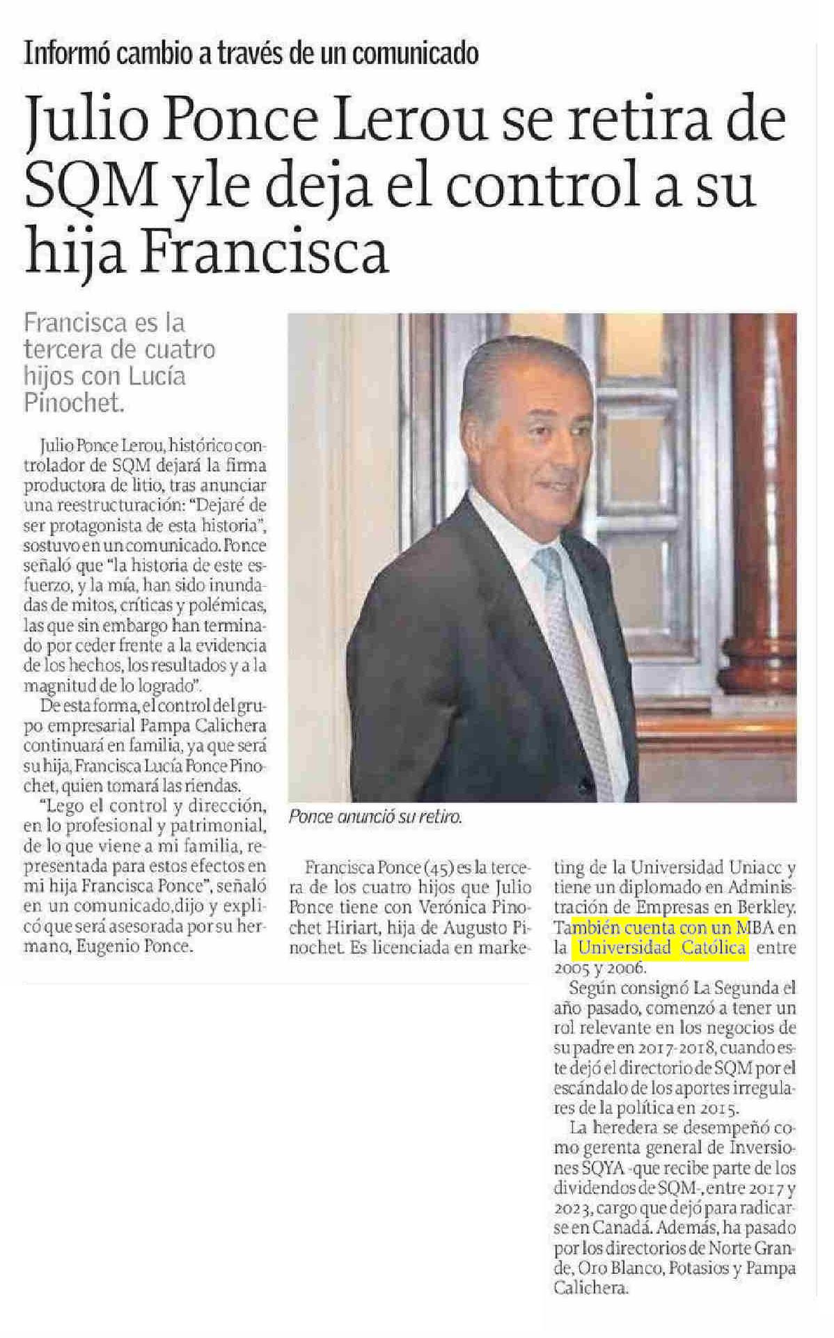 Título: Julio Ponce Lerou se retira de SQM yle deja el control a su hija Francisca