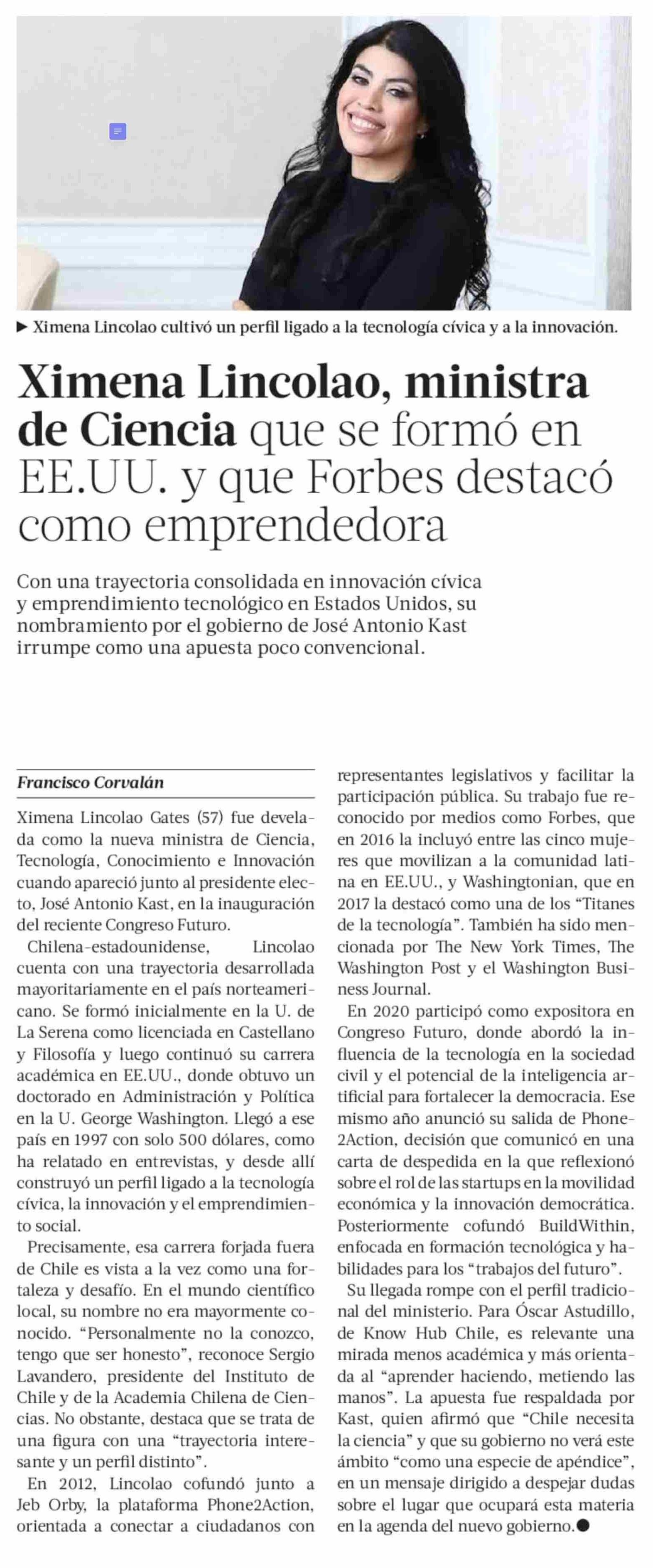 Ximena Lincolao, ministra de Ciencia que se formó en EE.UU. y que Forbes destacó como emprendedora 21-01-2026 La Tercera |