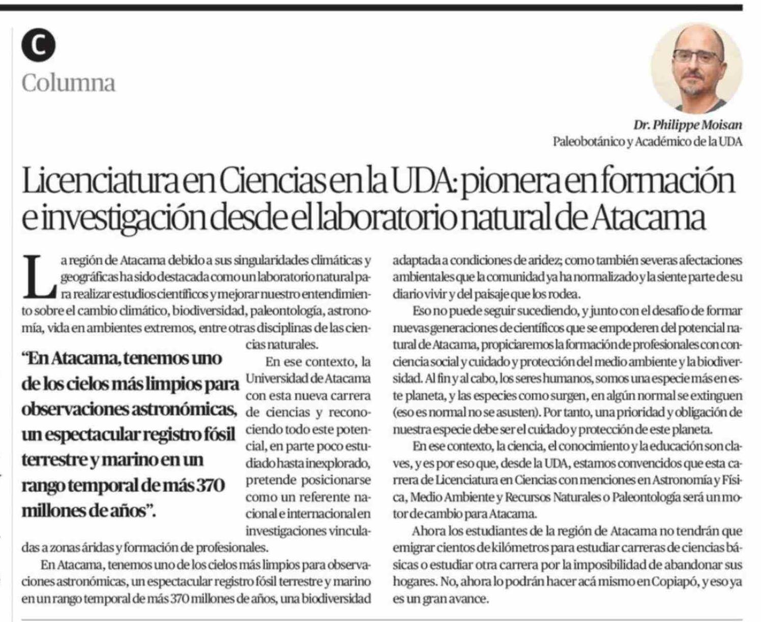Título: Columnas de Opinión: Licenciatura en Ciencias en la UDA: pionera en formación e investigación desde el laboratorio natural de Atacama