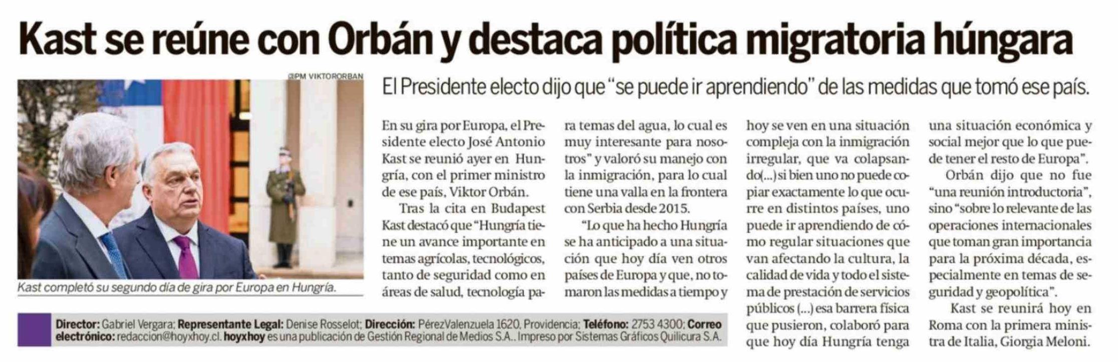 Título: Kast se reúne con Orbán y destaca política migratoria húngara