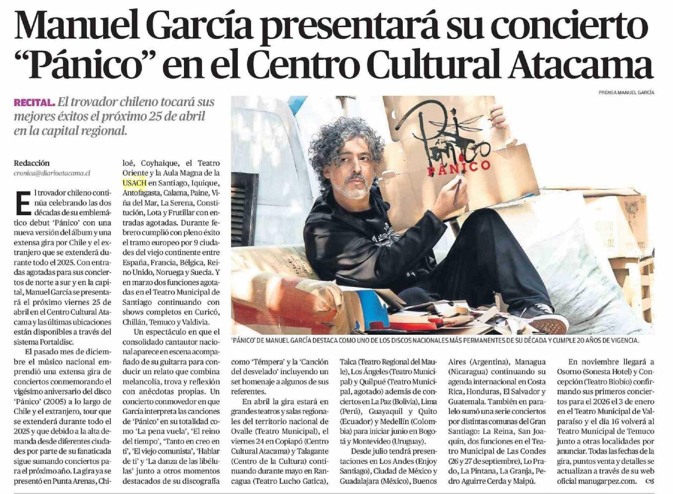 Manuel García presentará su concierto "Pánico" en el Centro Cultural Atacama 08-04-2025 El Diario de Atacama |