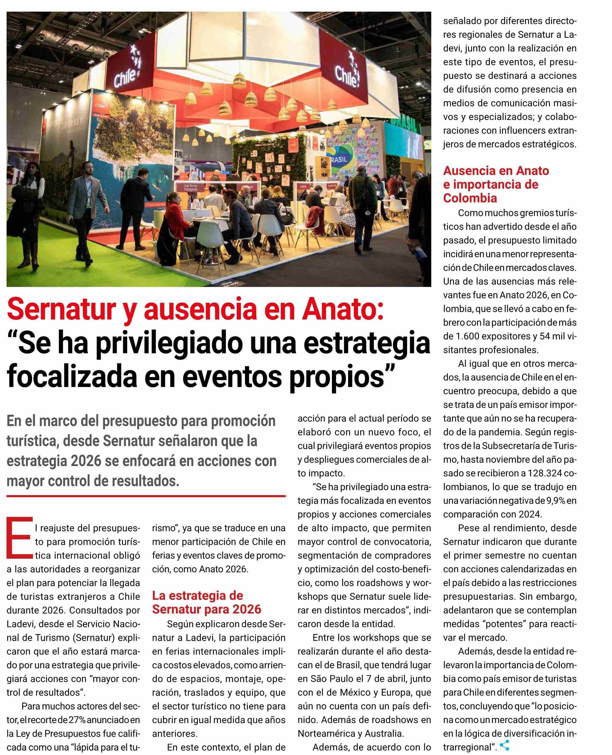 Sernatur y ausencia en Anato: “Se ha privilegiado una estrategia focalizada en eventos propios” 09-03-2026 Revista La Agencia de Viajes |