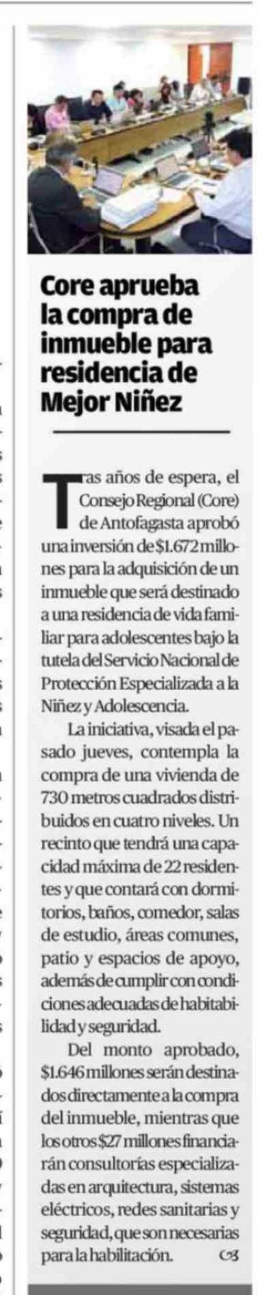 Core aprueba la compra de inmueble para residencia de Mejor Niñez 06-04-2026 El Mercurio de Calama |
