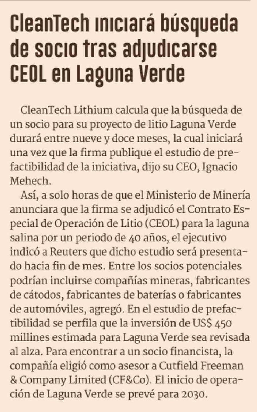 | Título: | CleanTech Iniciará búsqueda de socio tras adjudicarse CEOL en Laguna Verde |