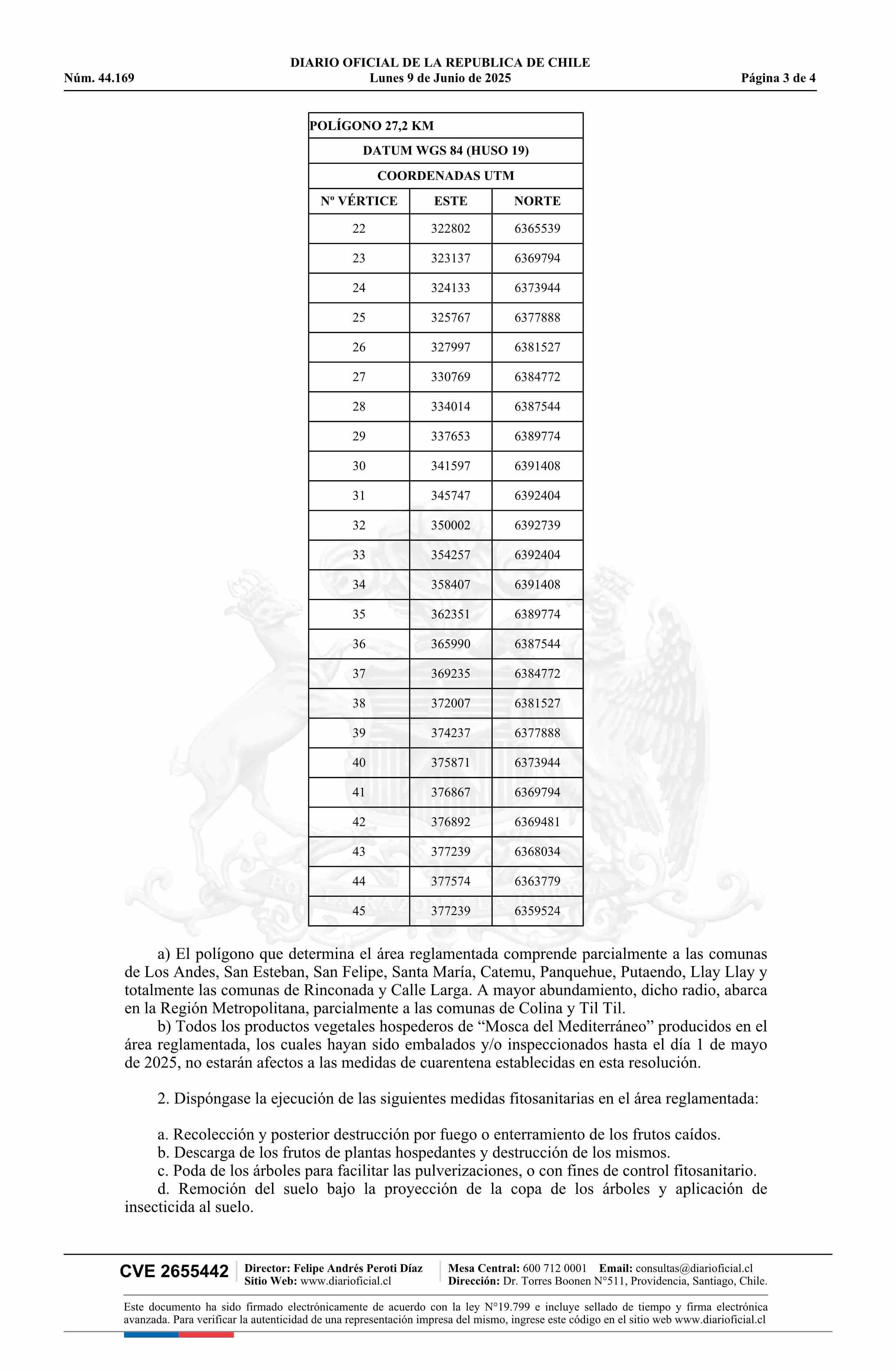 Resolución exenta número 1.171, de 2025.- Establece regulaciones cuarentenarias para el control y erradicación de la Mosca del Mediterráneo (Ceratitis capitata W.) en los lugares que indica 09-06-2025 DIARIO OFICIAL CHILE - BOLETÍN OFICIAL DE MINERÍA |