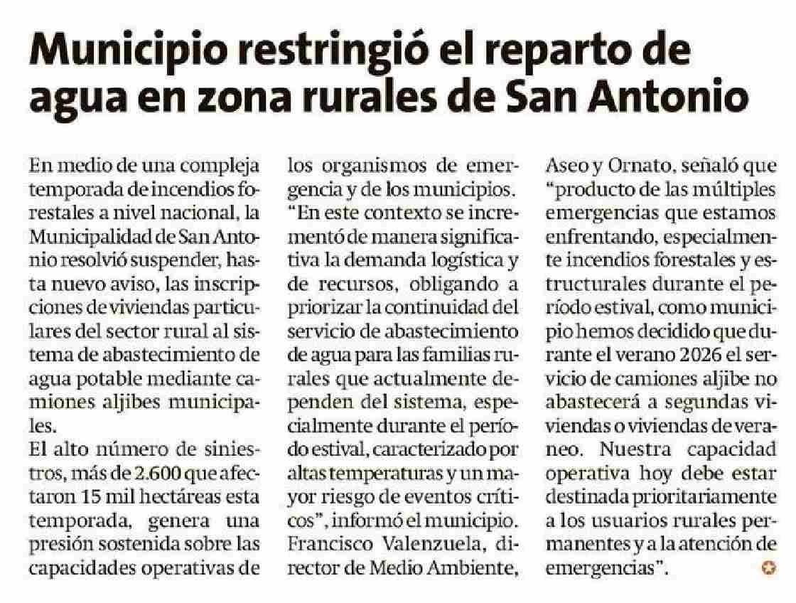 Municipio restringió el reparto de agua en zona rurales de San Antonio 16-01-2026 El Líder |
