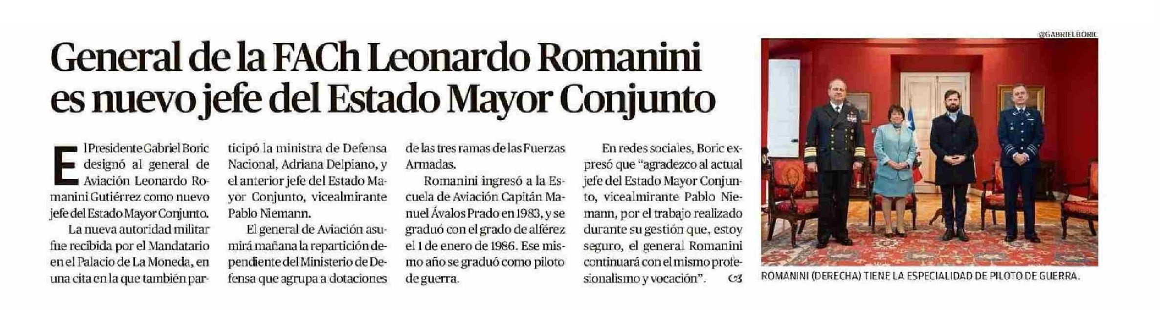 | Título: | General de la FACh Leonardo Romanini es nuevo jefe del Estado Mayor Conjunto |