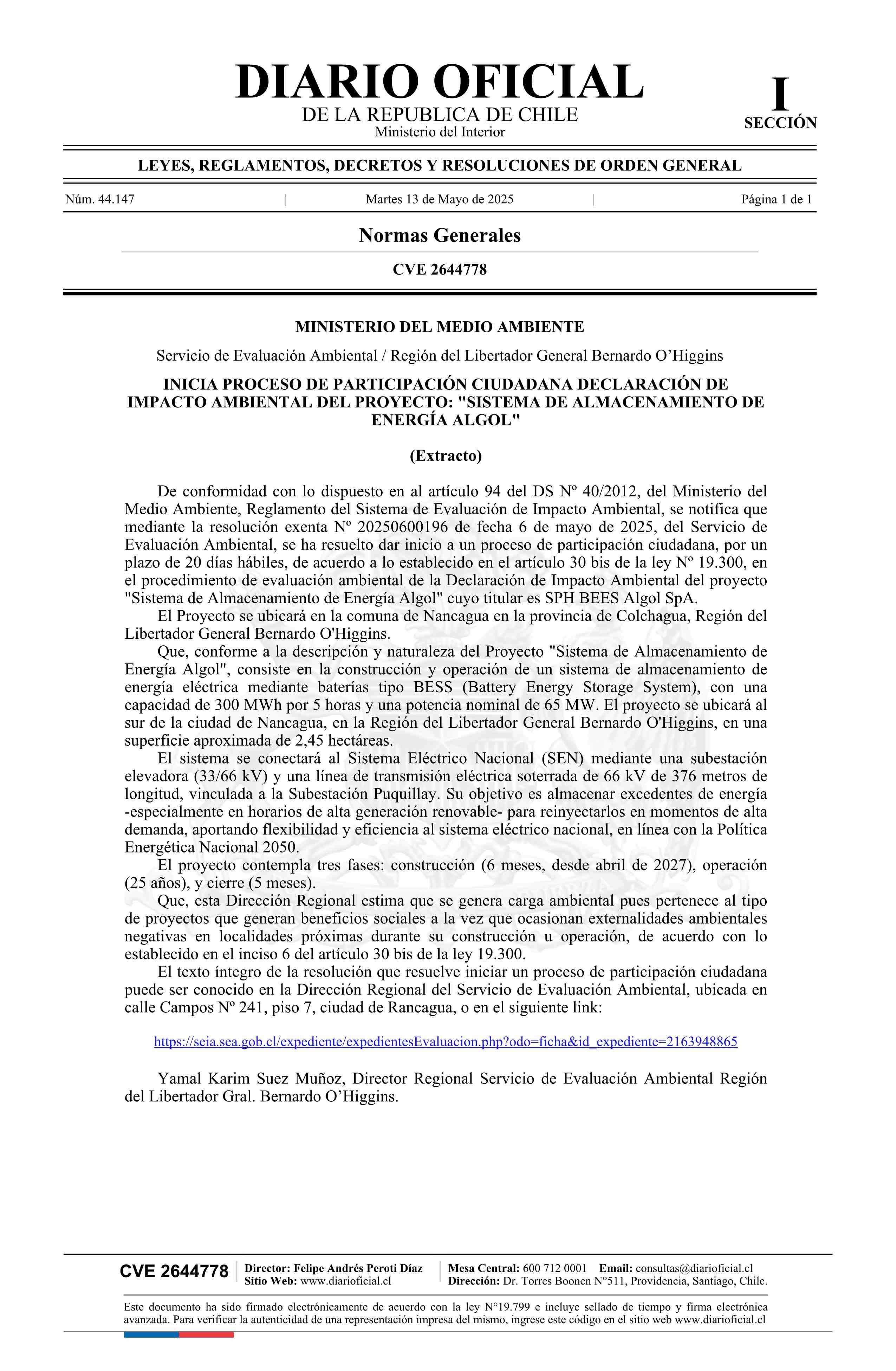 Extracto de resolución exenta número 20250600196, de 2025.- Inicia proceso de participación ciudadana en Declaración de Impacto Ambiental del proyecto Sistema de Almacenamiento de Energía Algol 13-05-2025 DIARIO OFICIAL CHILE - BOLETÍN OFICIAL DE MINERÍA |