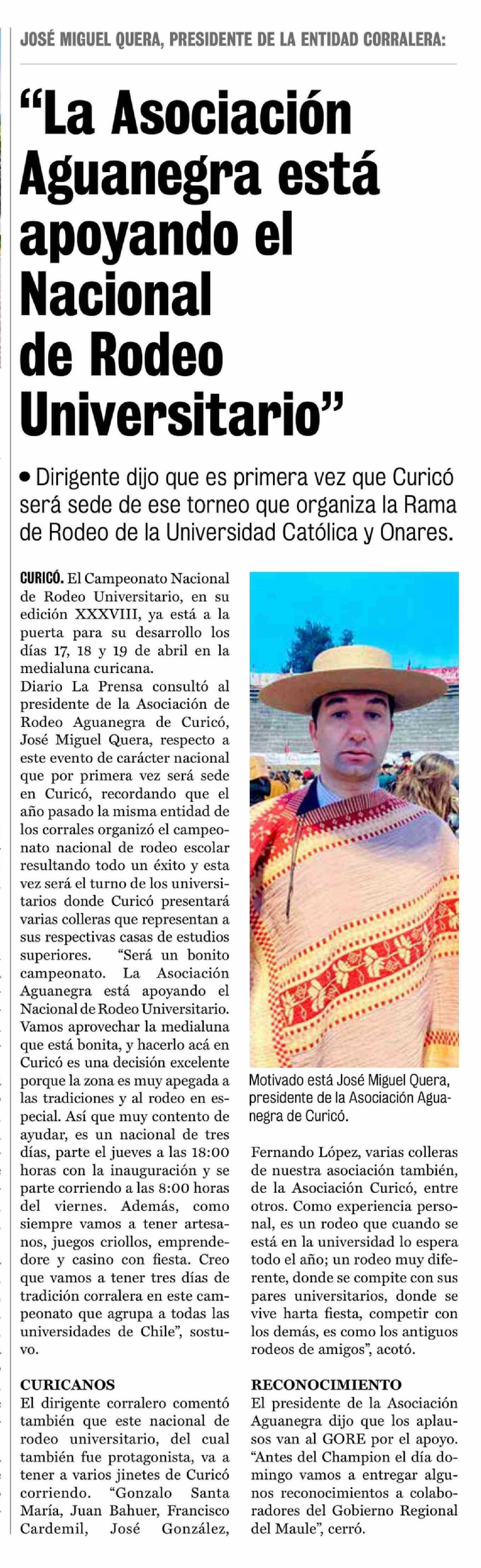 "La Asociación Aguanegra está apoyando el Nacional de Rodeo Universitario" 16-04-2026 La Prensa de Curicó |