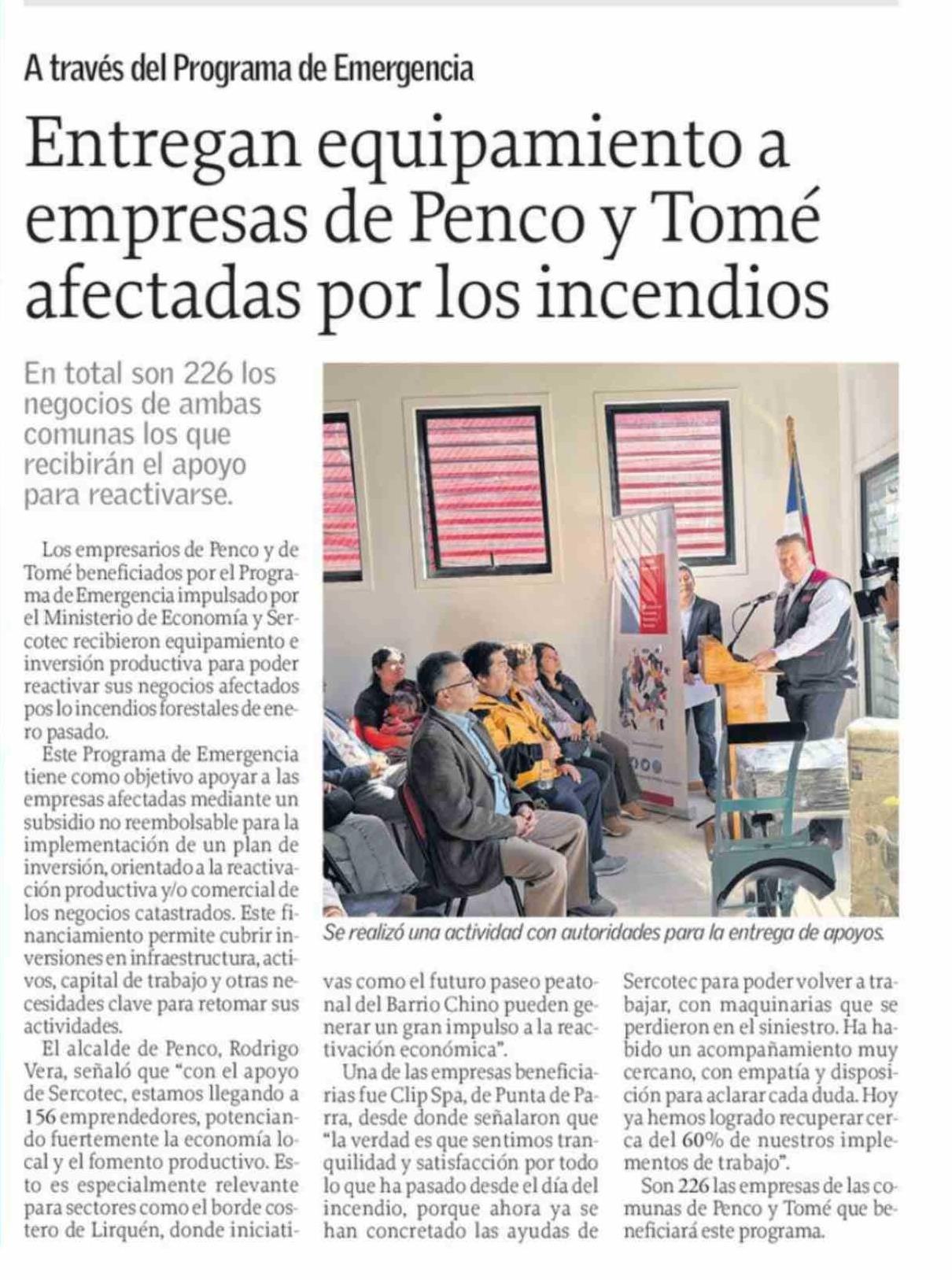 Entregan equipamiento a empresas de Penco y Tomé afectadas por los incendios 06-04-2026 El Sur |