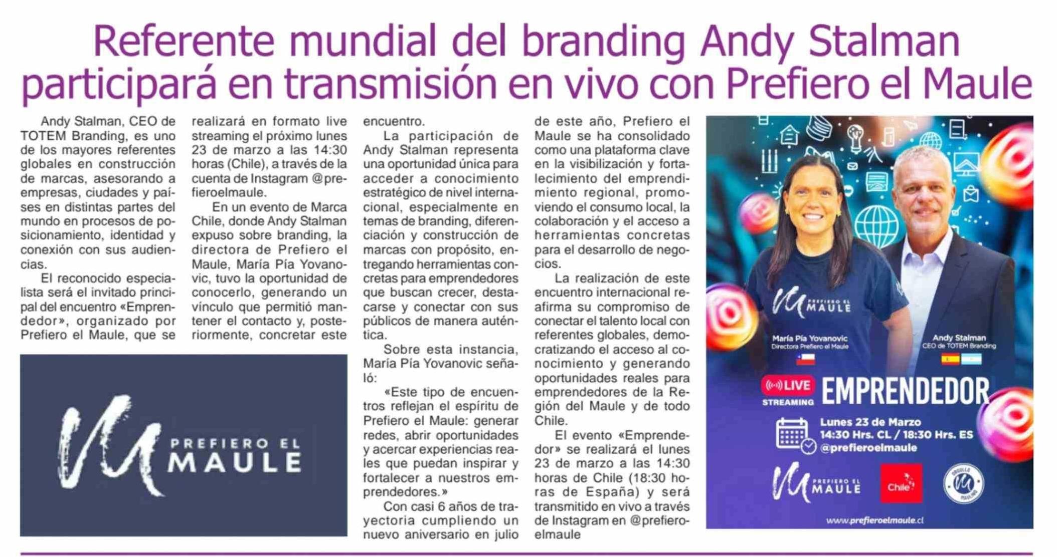 | Título: | Referente mundial del branding Andy Stalman participará en transmisión en vivo con Prefiero el Maule |