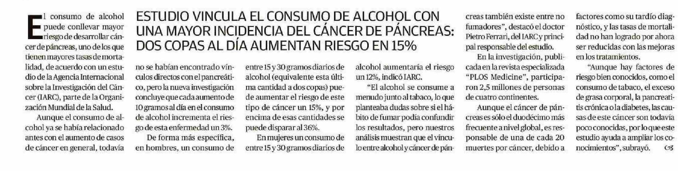 ESTUDIO VINCULA EL CONSUMO DE ALCOHOL CON UNA MAYOR INCIDENCIA DEL CÁNCER DE PÁNCREAS: DOS COPAS AL DÍA AUMENTAN RIESGO EN 15% 27-05-2025 El Austral de Osorno |