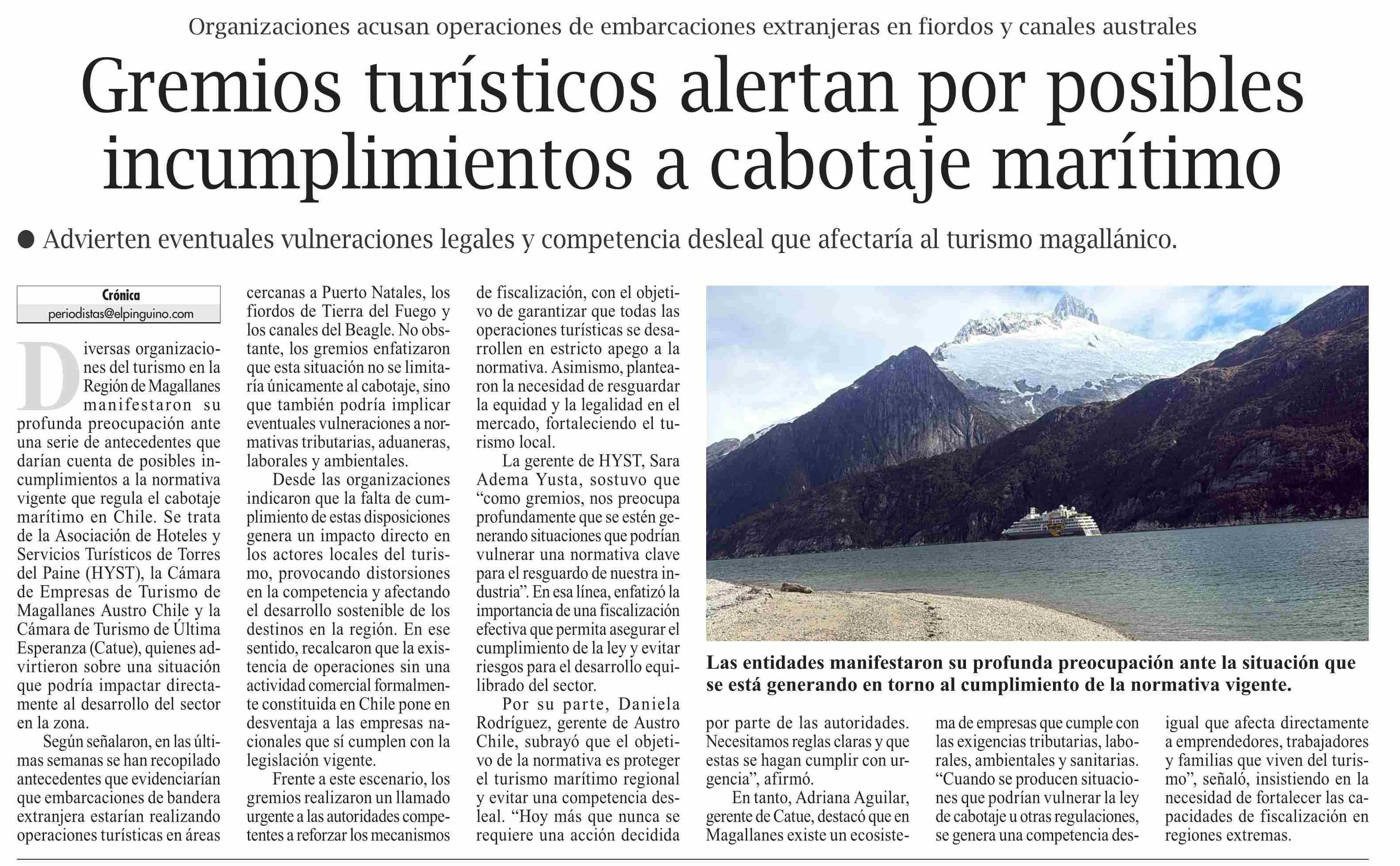 Gremios turísticos alertan por posibles incumplimientos a cabotaje marítimo 13-04-2026 El Pingüino |