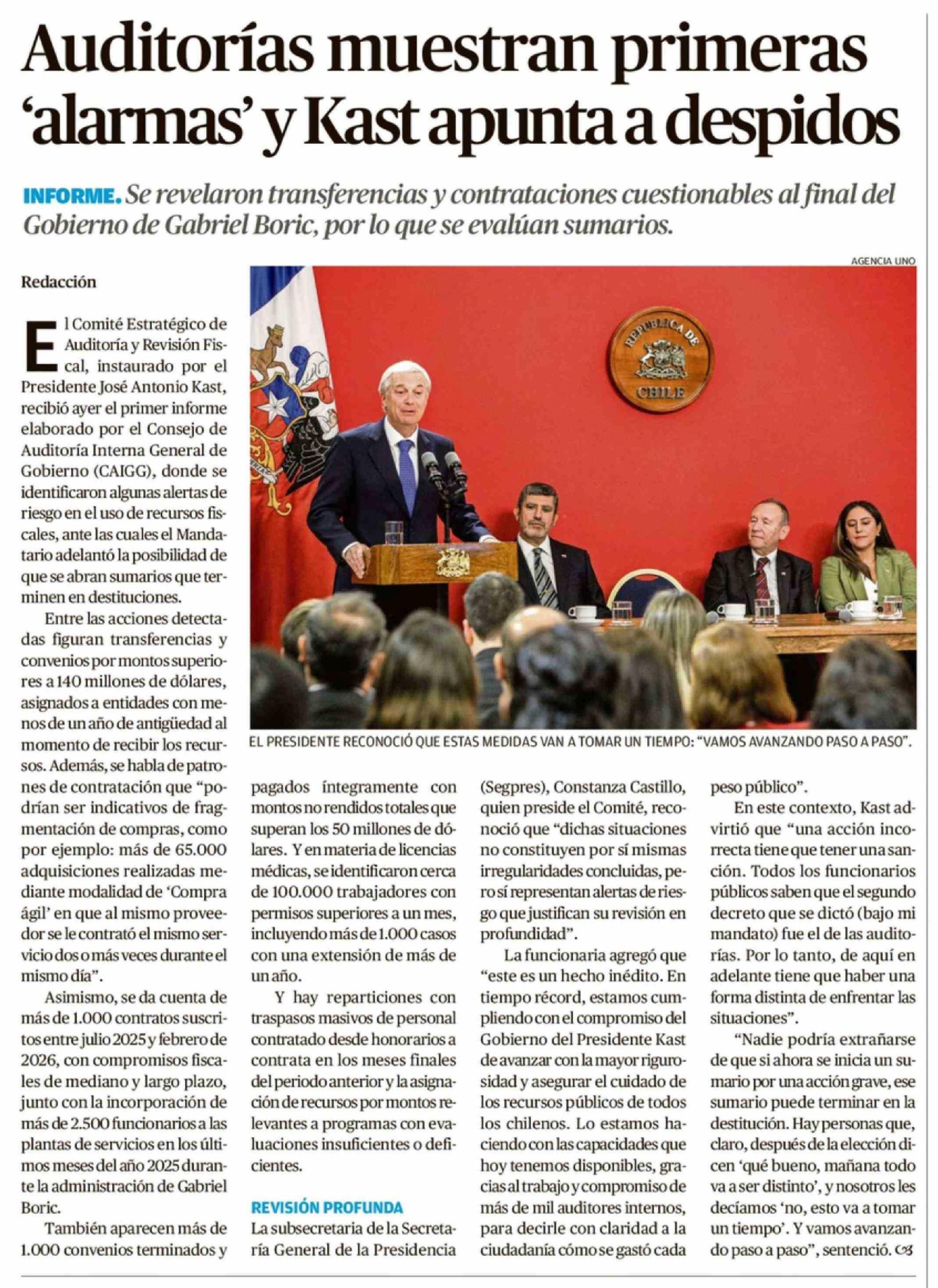 | Título: | Auditorías muestran primeras 'alarmas' y Kast apunta a despidos |