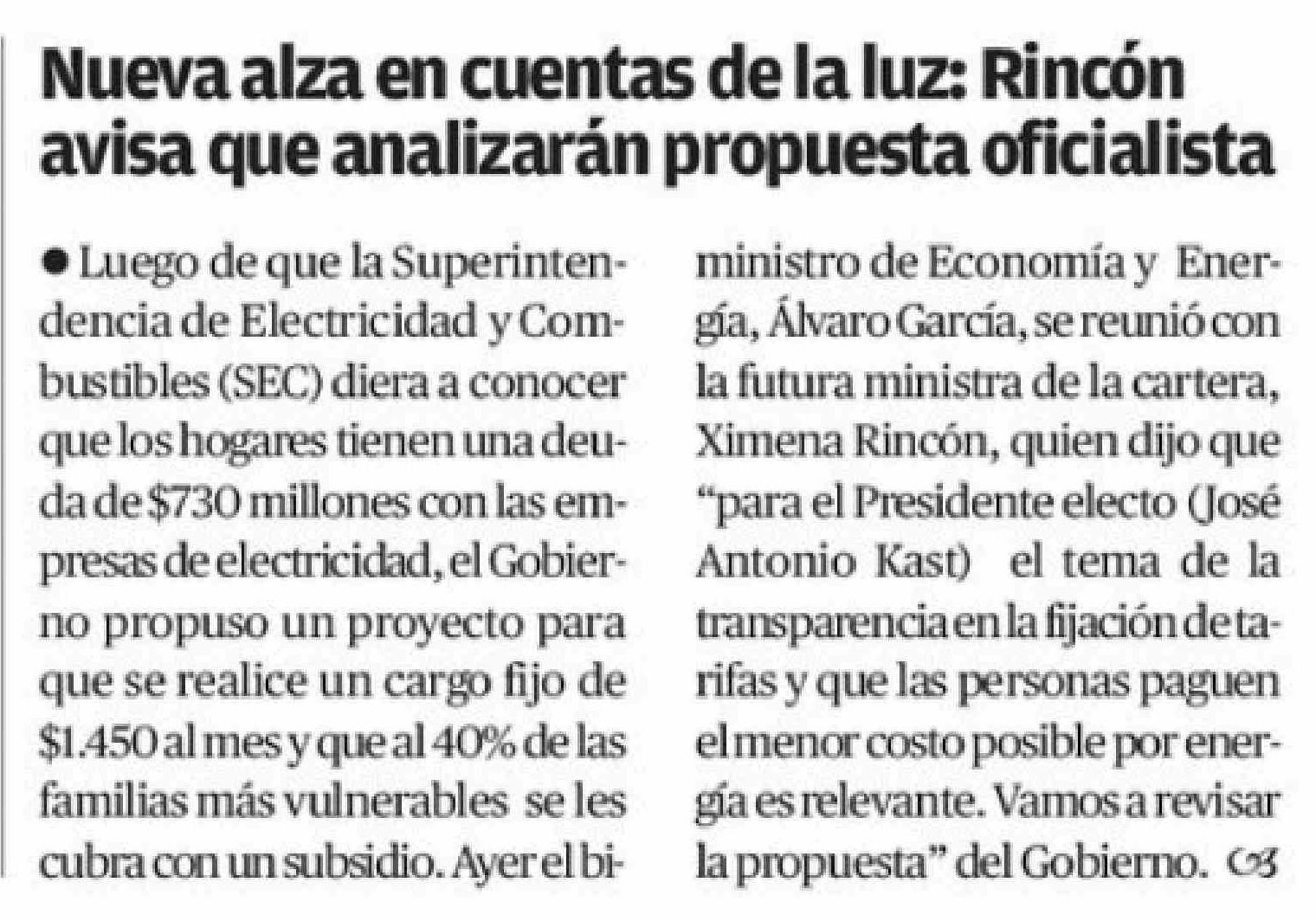 Título: Nueva alza en cuentas de la luz: Rincón avisa que analizarán propuesta oficialista