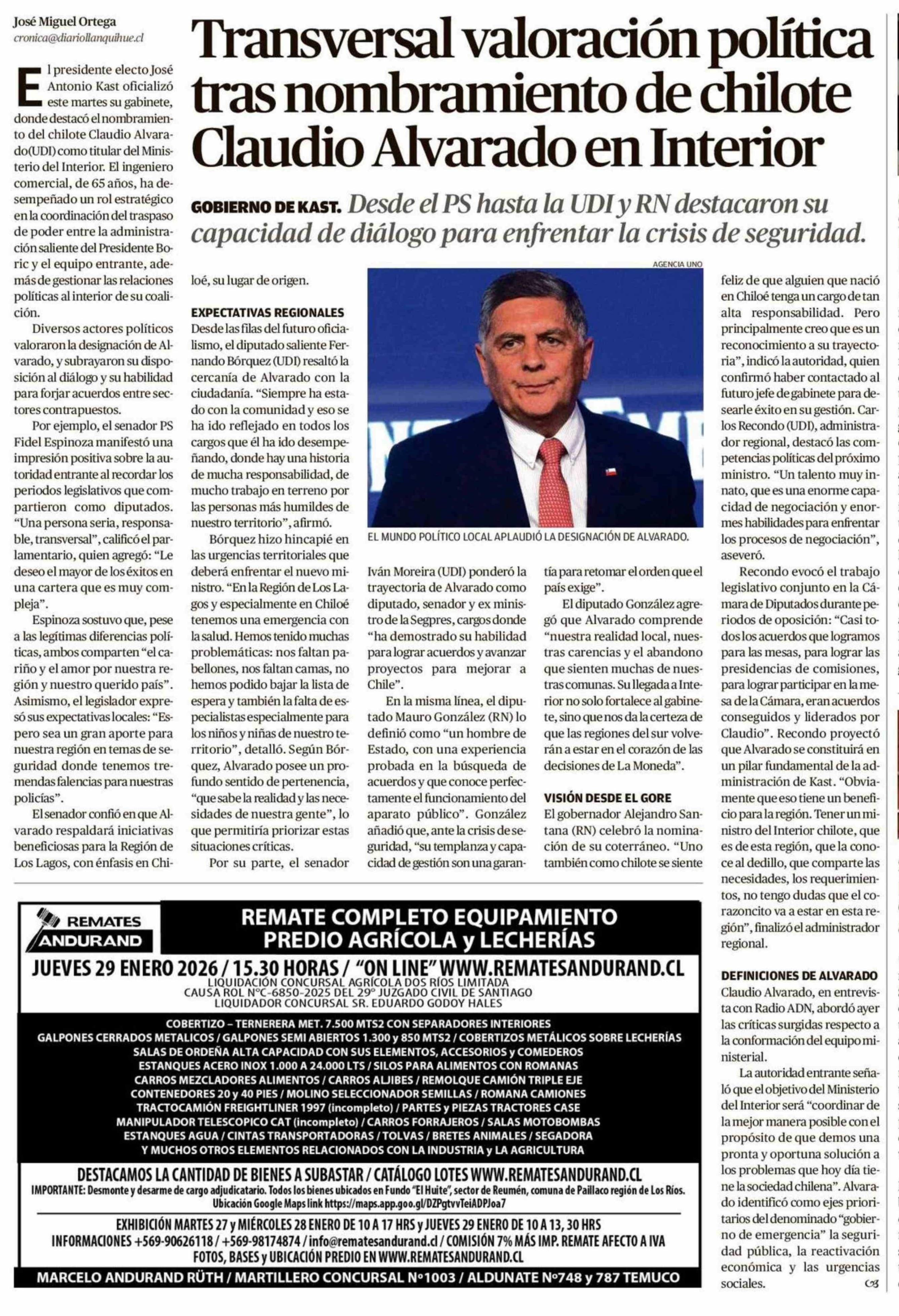 Título: Transversal valoración política tras nombramiento de chilote Claudio Alvarado en Interior