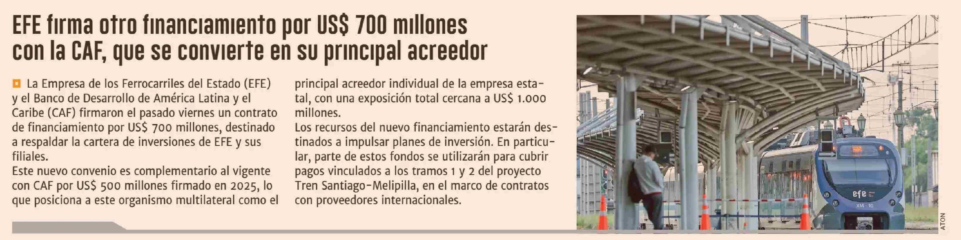 EFE firma otro financiamiento por US$ 700 millones con la CAF, que se convierte en su principal acreedor 27-01-2026 Diario Financiero |