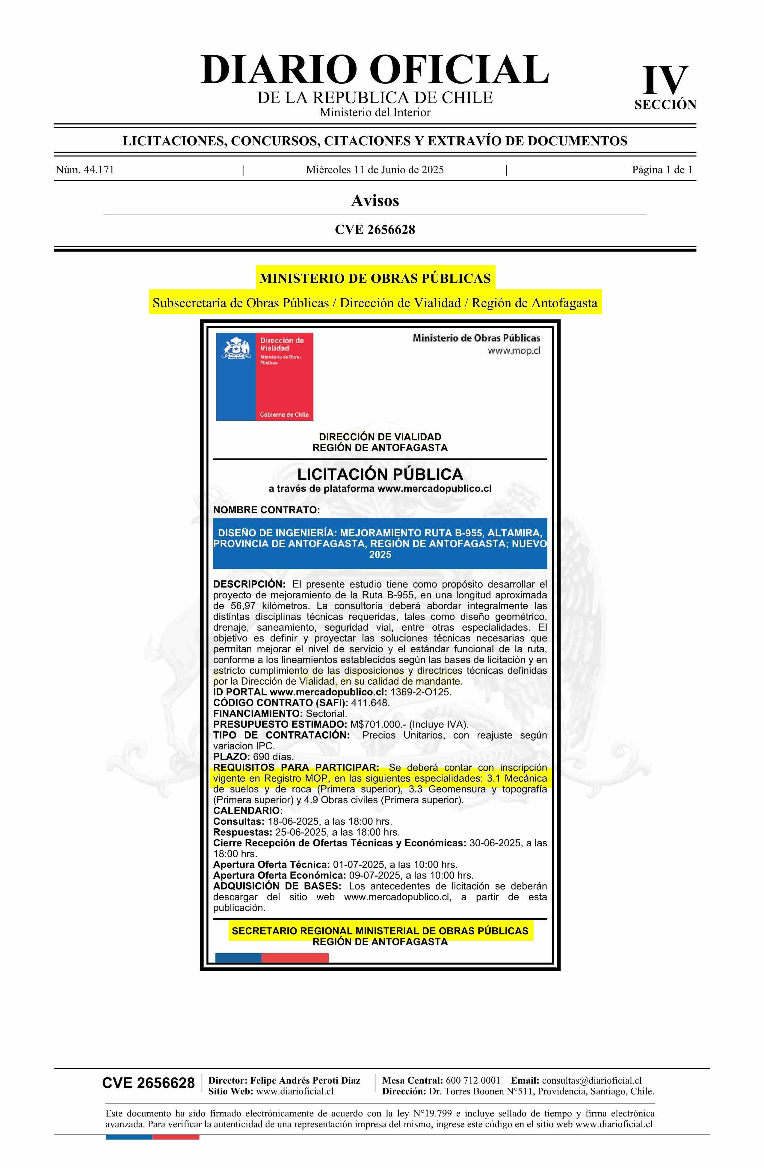 Título: AVISO LICITACIONES: Diseño de Ingeniería: Mejoramiento Ruta B-955, Altamira, Provincia de Antofagasta, Región de Antofagasta, Nuevo 2025???????