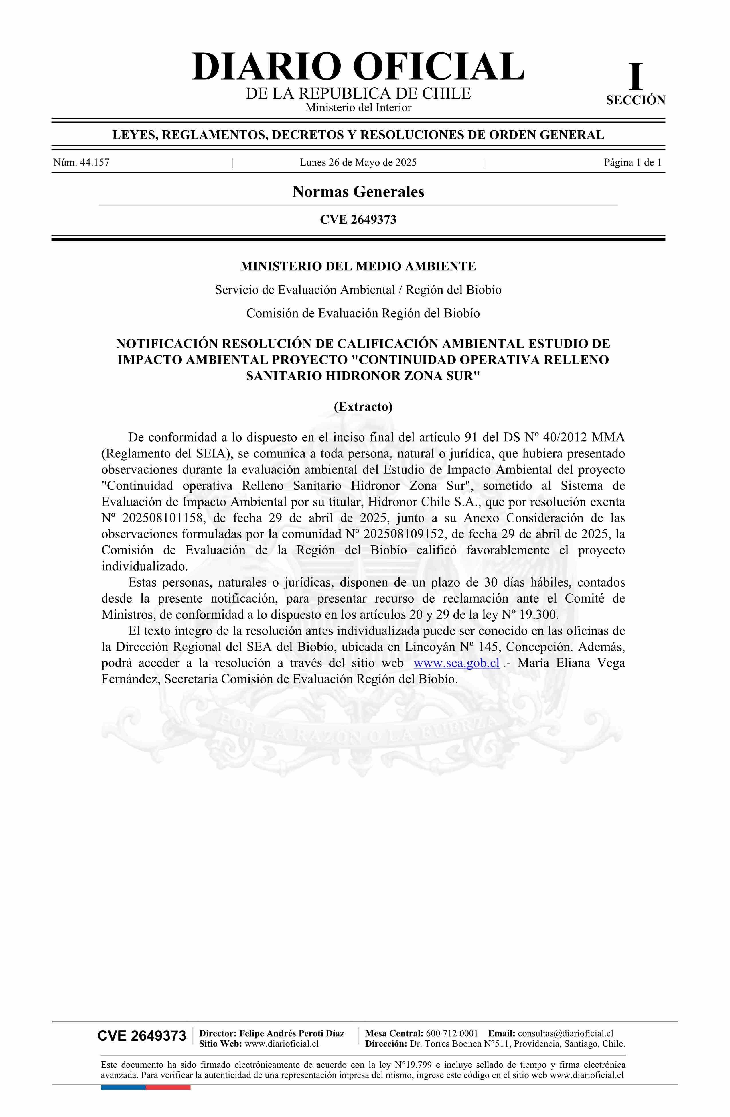 | Título: | Extracto de resolución exenta número 202508101158, de 2025.- Notifica Resolución de Calificación Ambiental del Estudio de Impacto Ambiental del proyecto Continuidad Operativa Relleno Sanitario Hidronor Zona Sur |