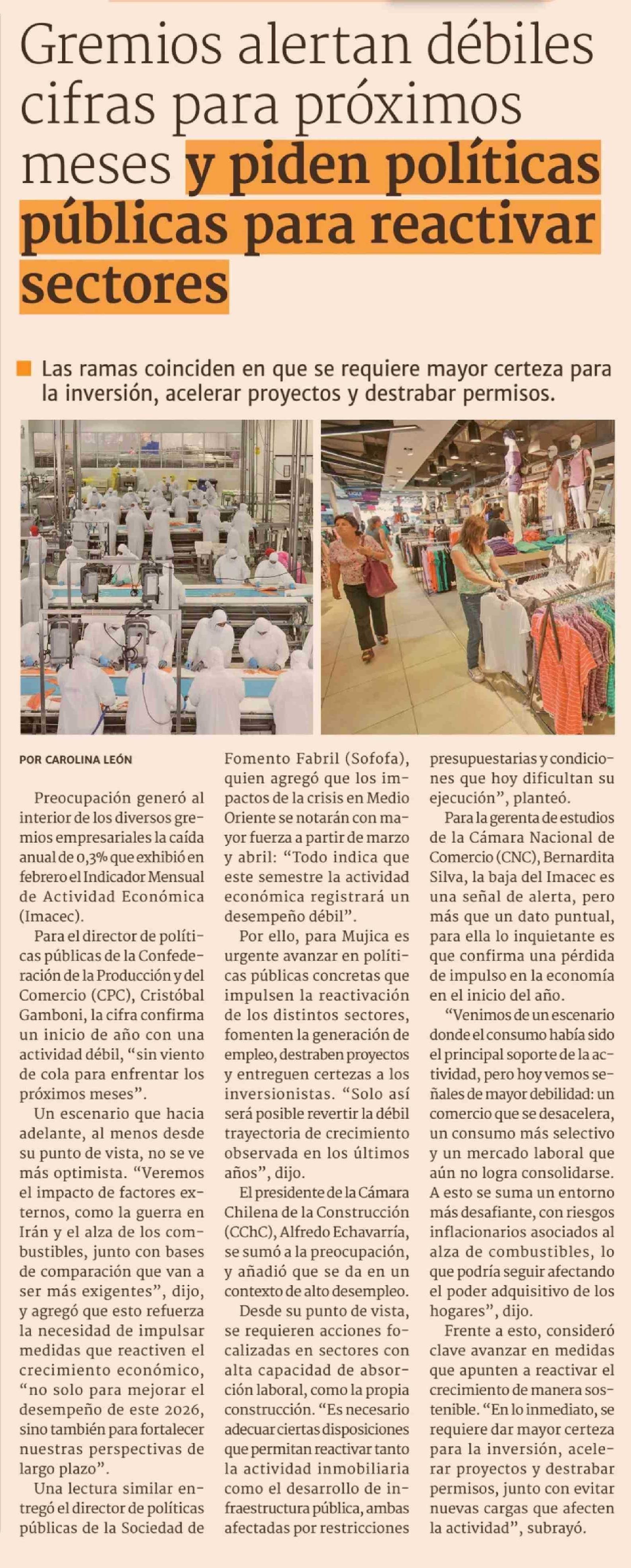 Gremios alertan débiles cifras para próximos meses y piden políticas públicas para reactivar 02-04-2026 Diario Financiero |