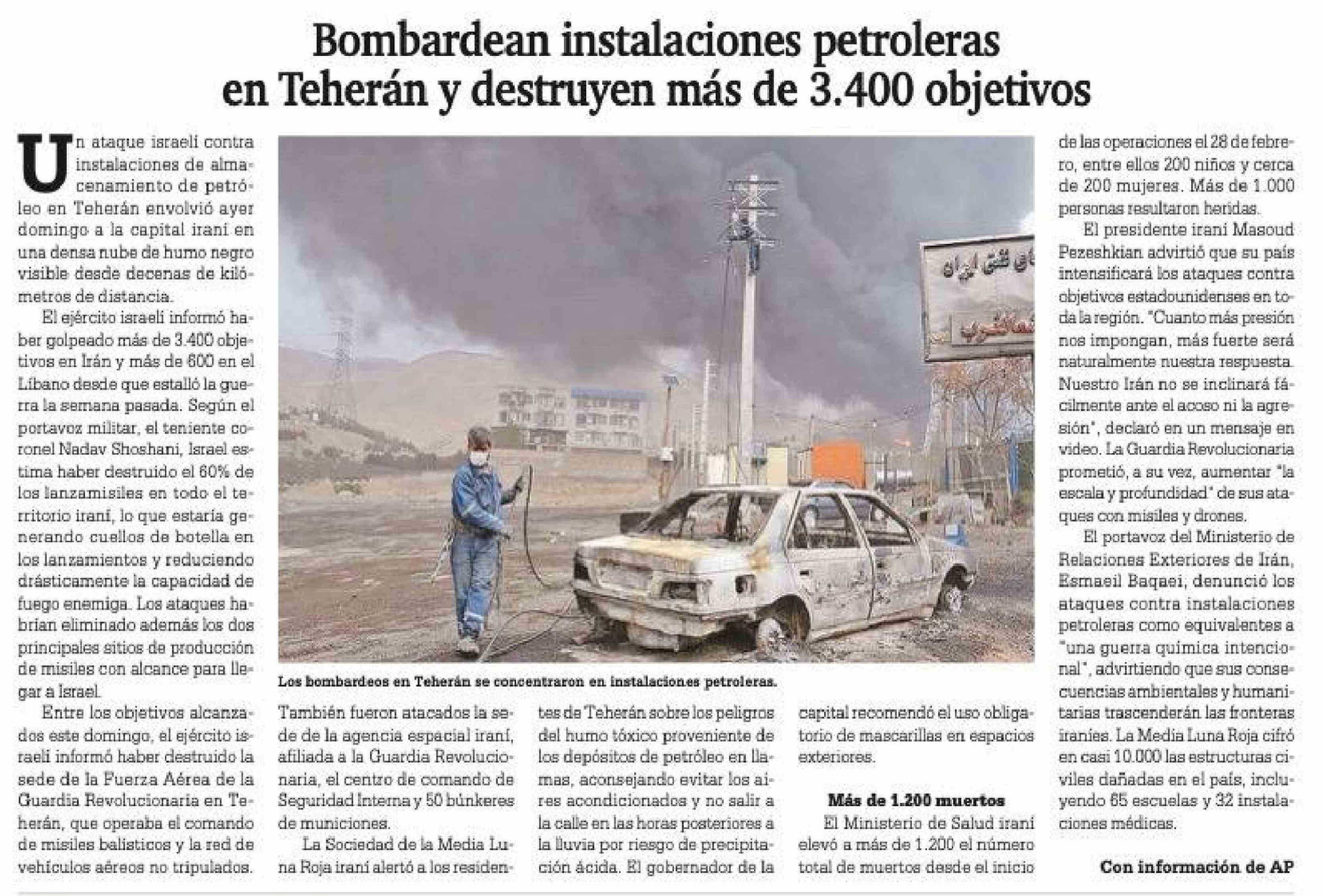 | Título: | Bombardean instalaciones petroleras en Teherán y destruyen más de 3.400 objetivos |