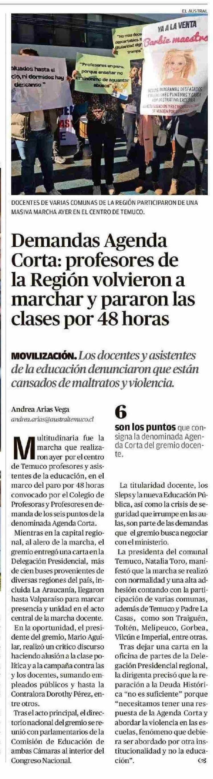 Demandas Agenda Corta: profesores de la Región volvieron a marchar y pararon las clases por 48 horas 06-06-2025 El Austral de la Araucanía |