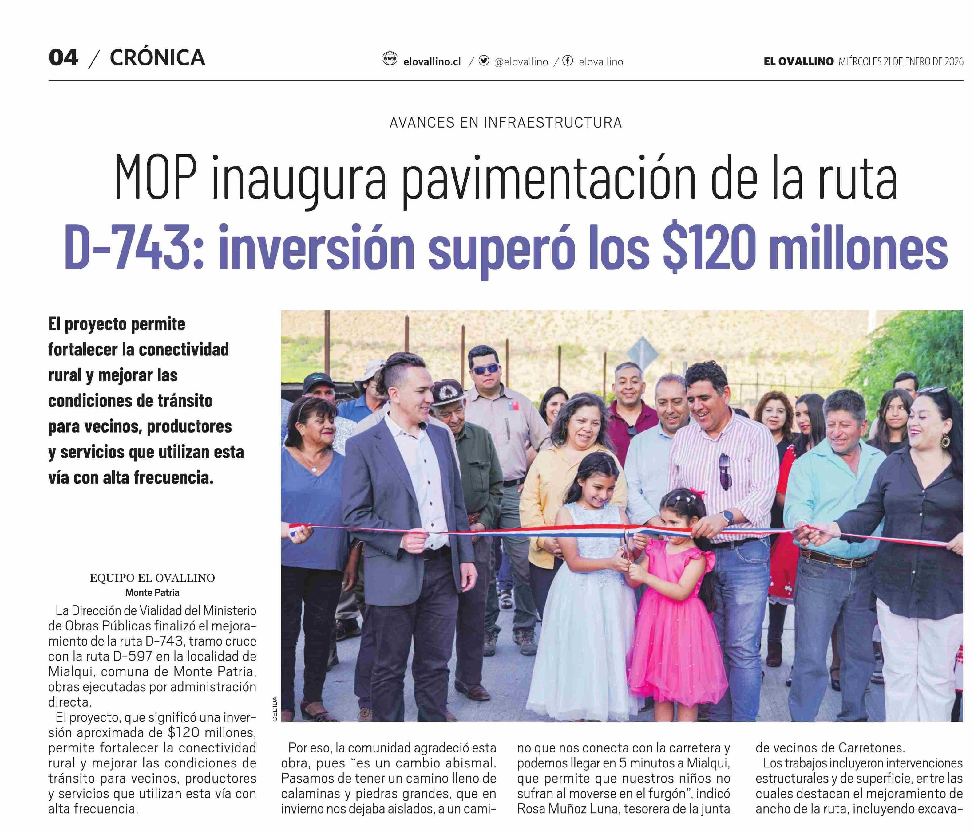 Título: MOP inaugura pavimentación de la ruta D743: inversión superó los $120 millones