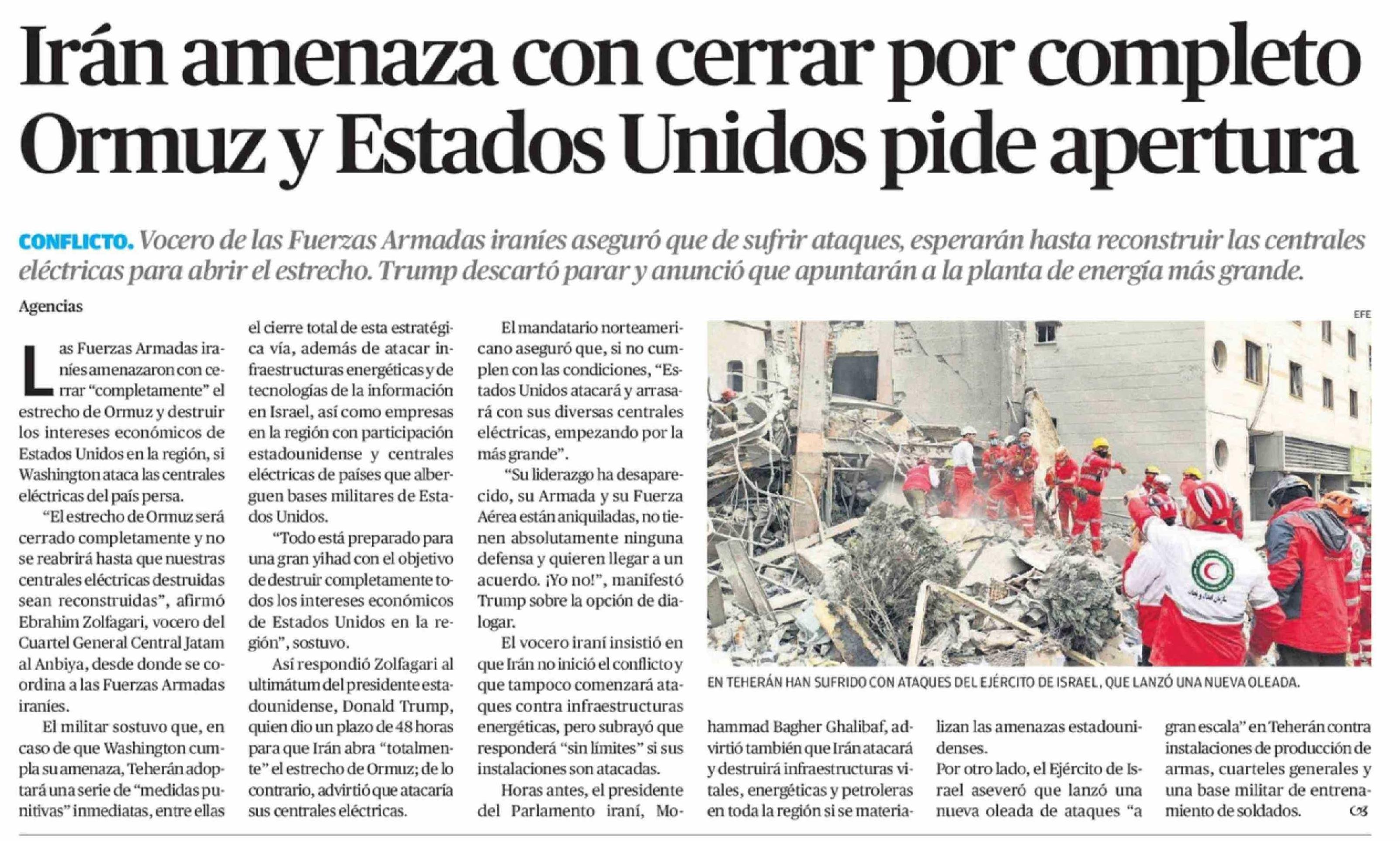 Iran amenaza con cerrar por completo Ormuz y Estados Unidos pide apertura 23-03-2026 El Mercurio de Antofagasta |