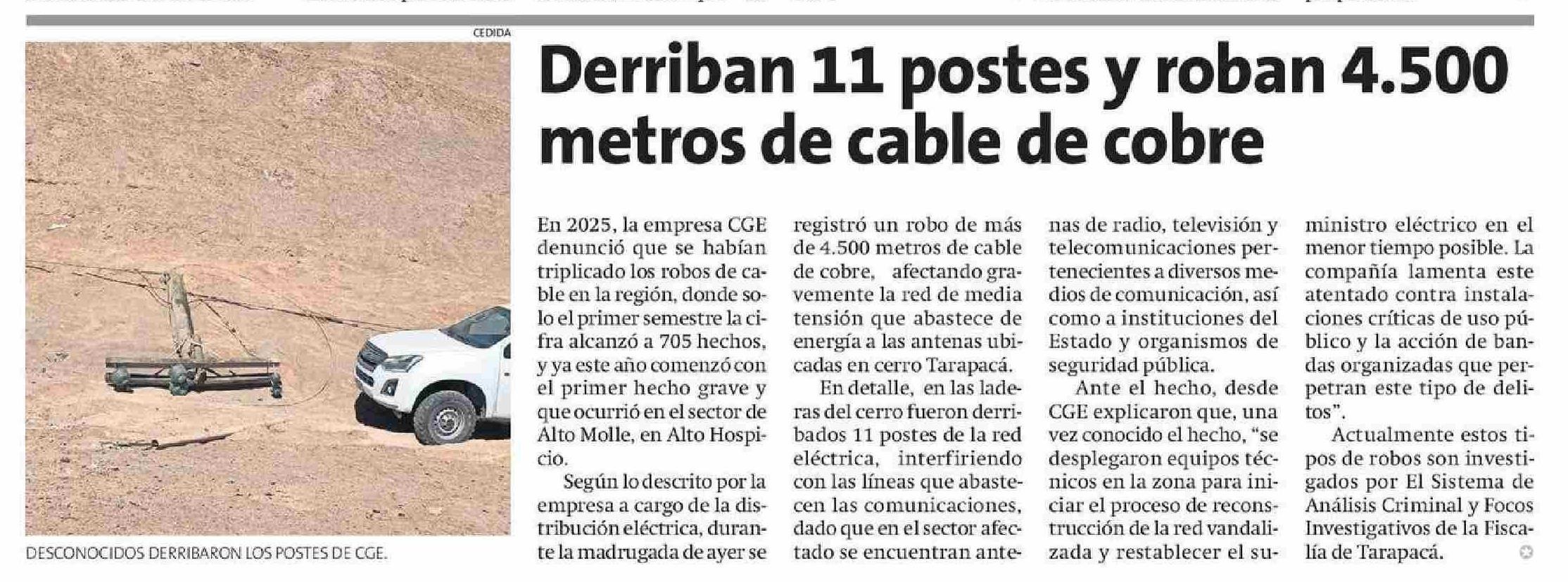 Derriban 11 postes y roban 4.500 metros de cable de cobre 11-01-2026 La Estrella de Iquique |