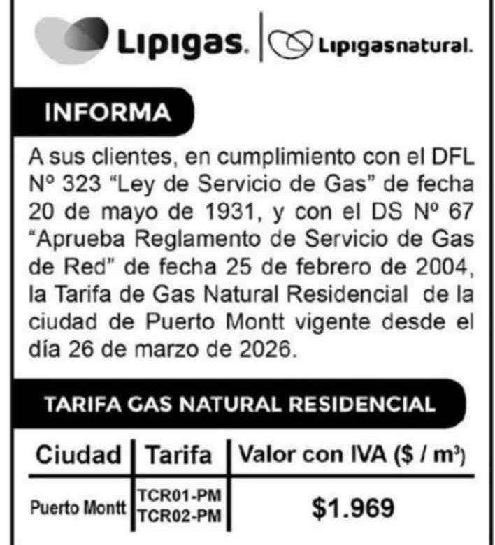 Extractos: INFORMA A sus clientes, en cumplimiento con el DFL Nº 323 "Ley de Servicio de Gas" de fecha 20 de mayo de 1931, y con el DS Nº 67 "Aprueba Reglamento de Servicio de Gas de Red" de fecha 25 de febrero de 2004, la Tarifa de Gas Natural Residencial de la ciudad de Puerto Montt vigente desde