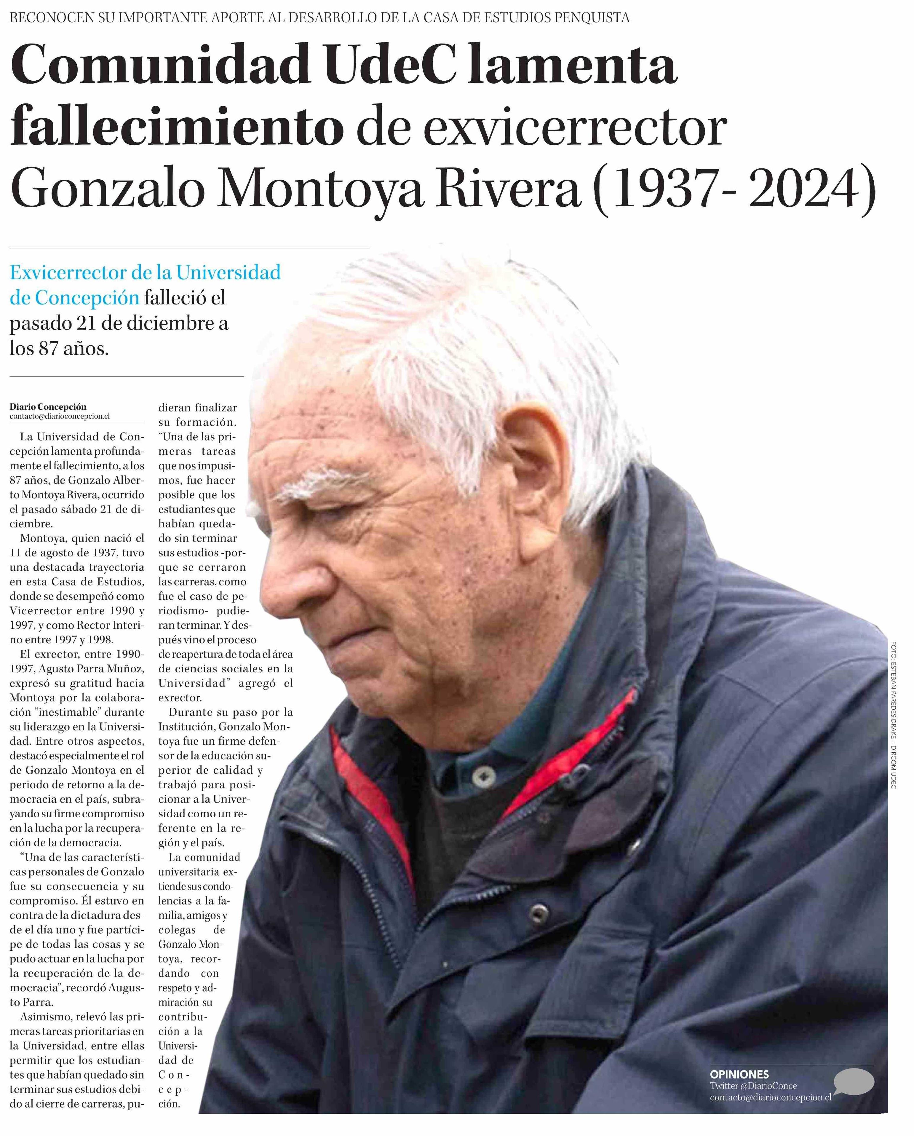 Comunidad UdeC lamenta fallecimiento de exvicerrector Gonzalo Montoya Rivera (1937- 2024) 24-12-2024 Diario Concepción |