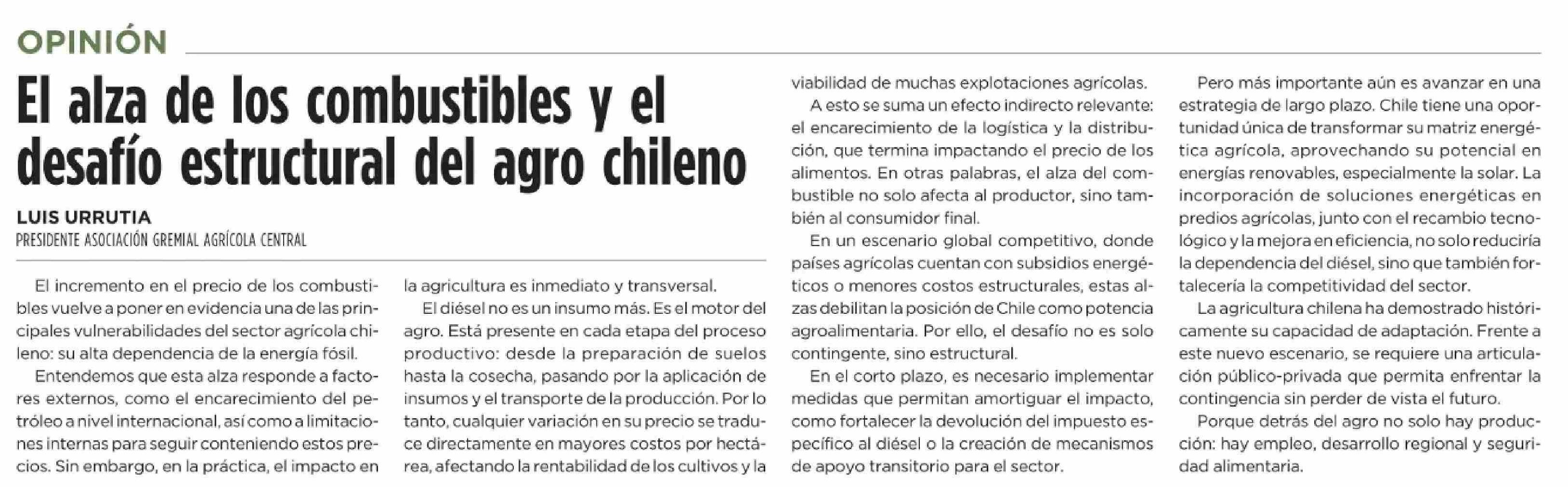 | Título: | Columnas de Opinión: El alza de los combustibles y el desafío estructural del agro chileno |
