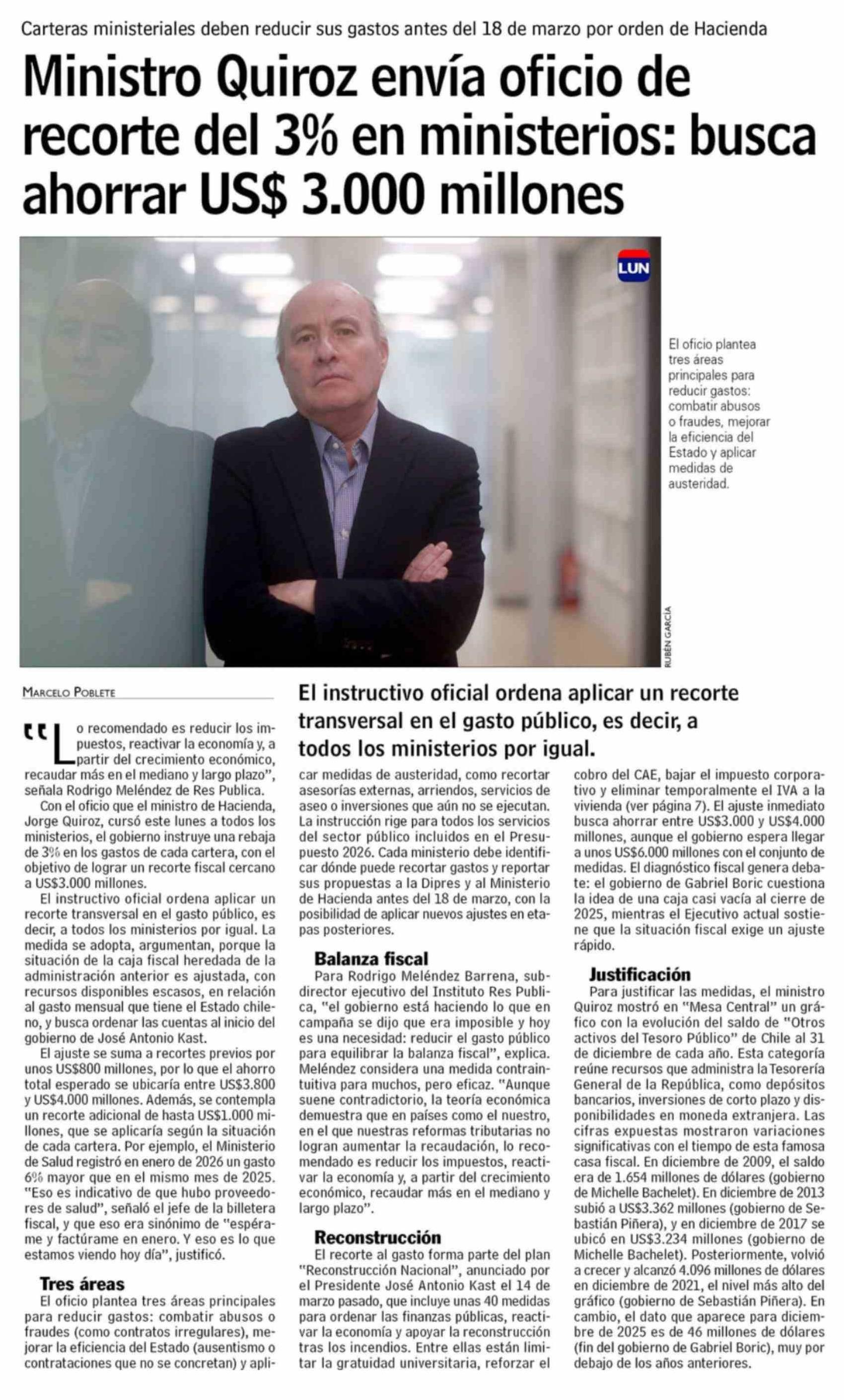 Ministro Quiroz envía oficio de recorte del 3% en ministerios: busca ahorrar US$ 3.000 millones 17-03-2026 Las Últimas Noticias |