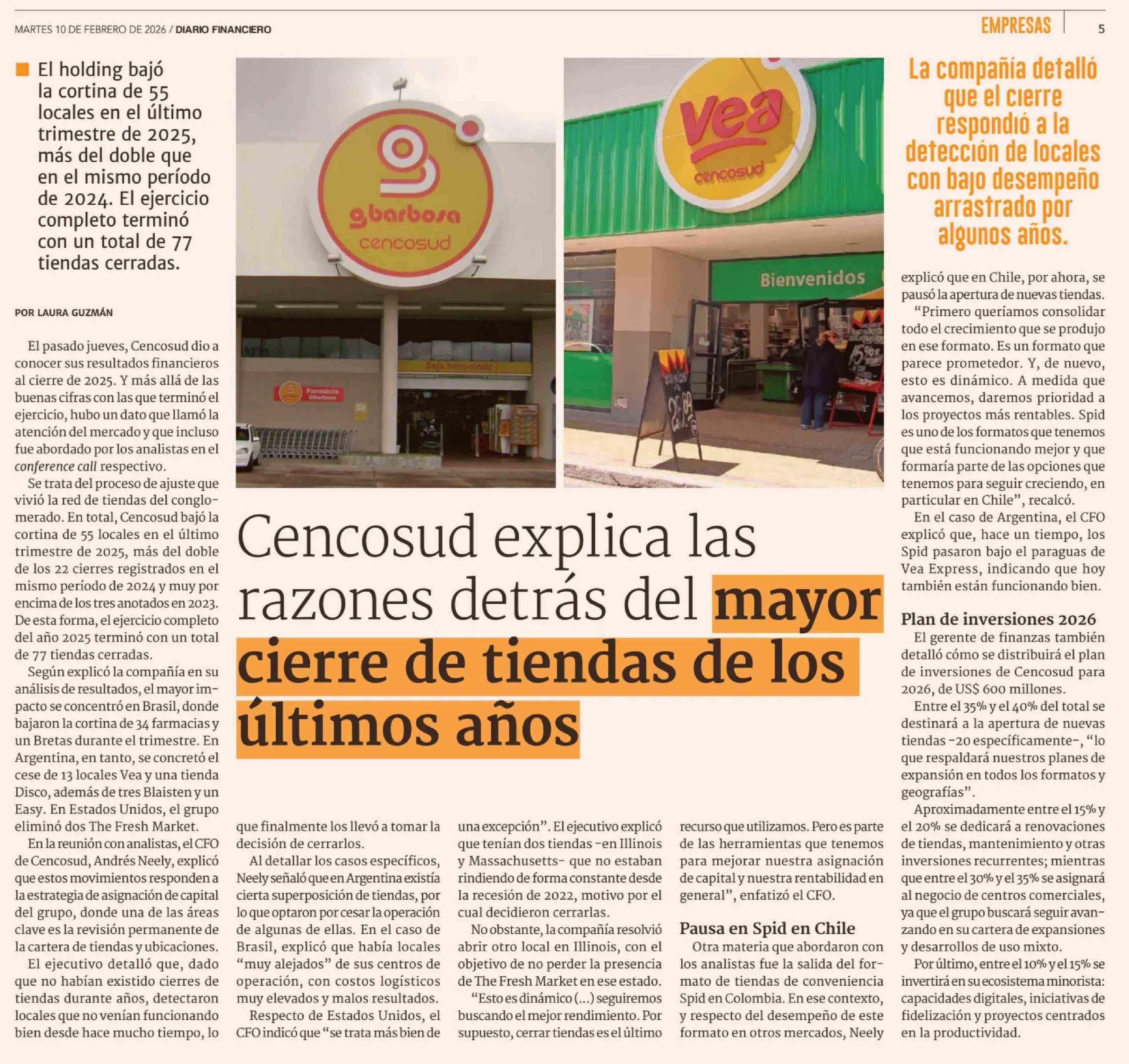 Cencosud explica las razones detrás del mayor cierre de tiendas de los últimos años 10-02-2026 Diario Financiero |