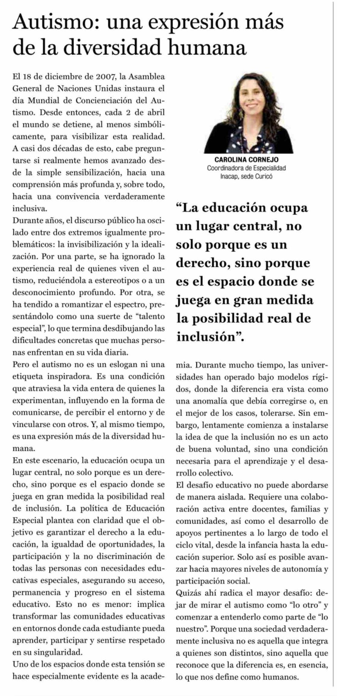 Columnas de Opinión: Autismo: una expresión más de la diversidad humana 04-04-2026 La Prensa de Curicó |