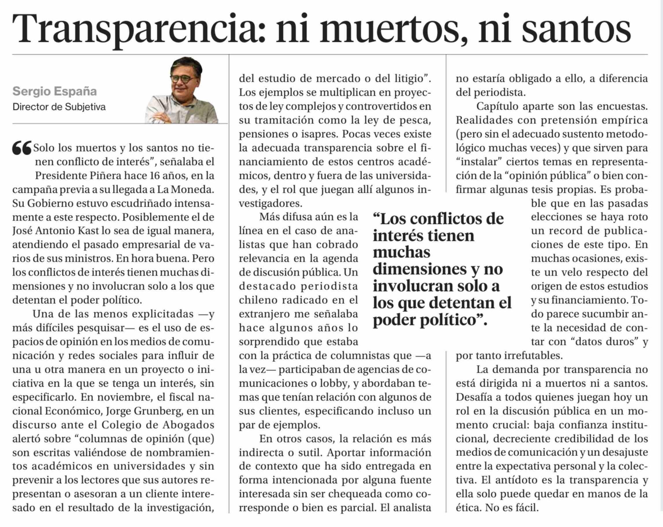 Columnas de Opinión: Transparencia: ni muertos, ni santos 16-02-2026 La Segunda |