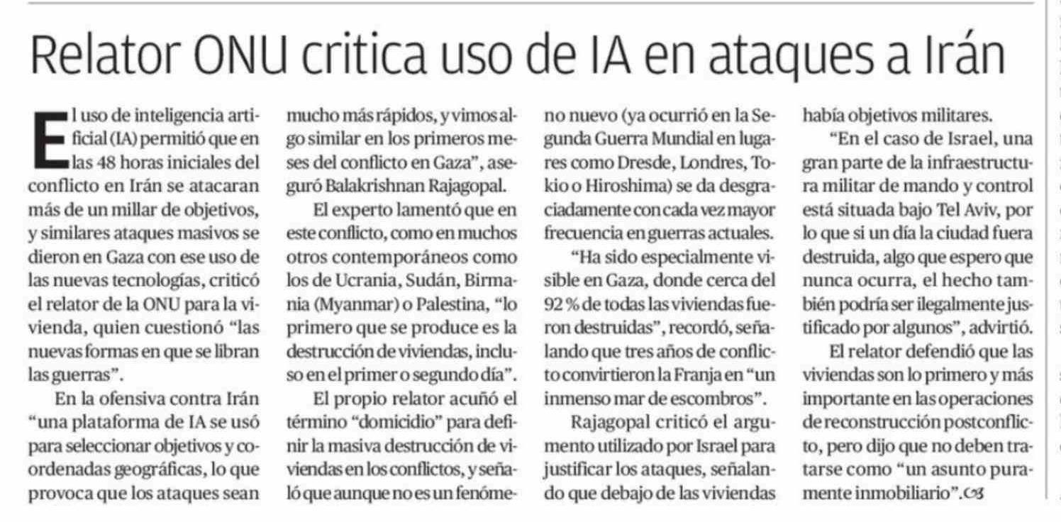 Título: Relator ONU critica uso de IA en ataques a Irán