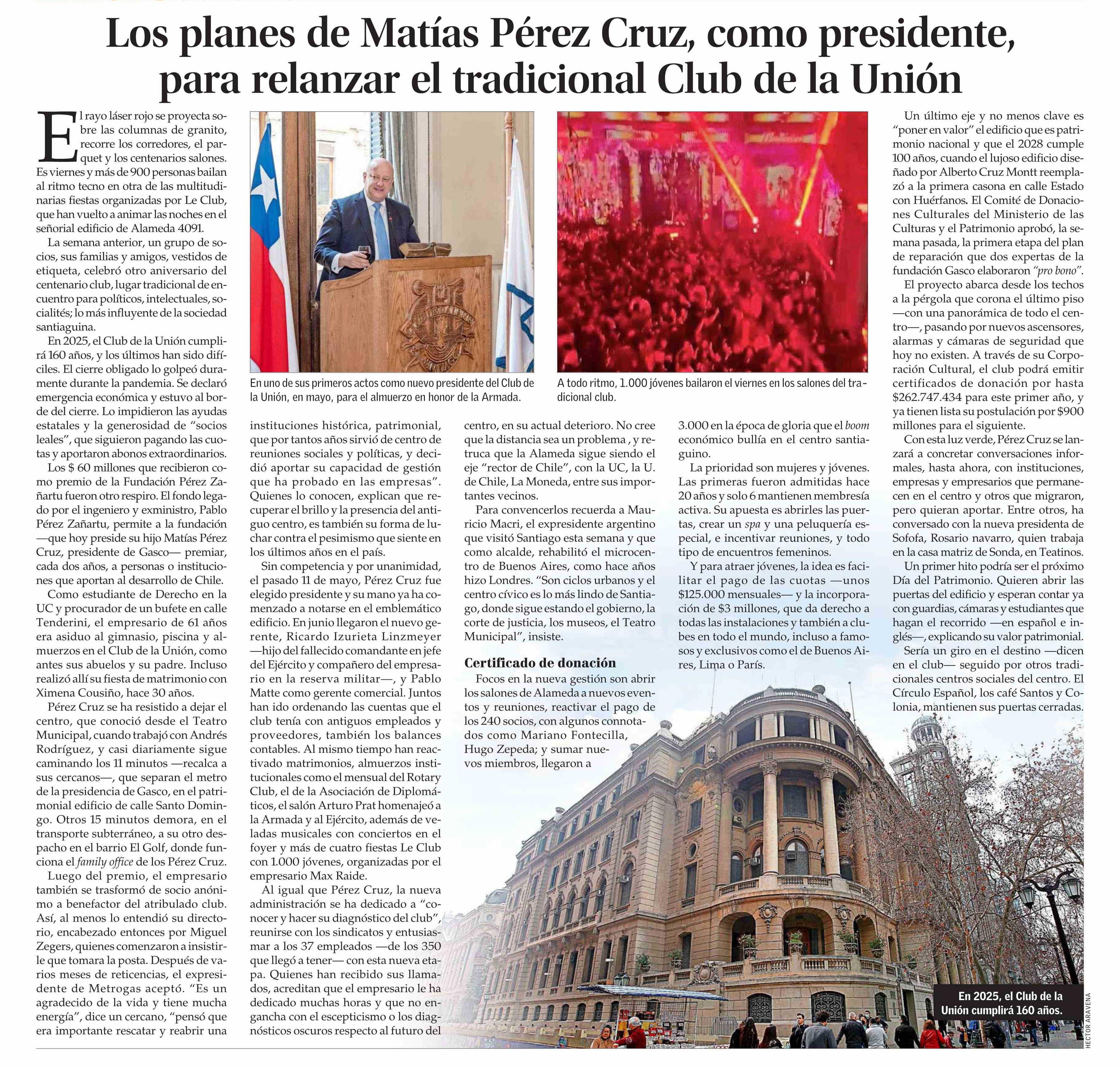 Los planes de Matías Pérez Cruz, como presidente, para relanzar el tradicional Club de la Unión 22-10-2023 El Mercurio |