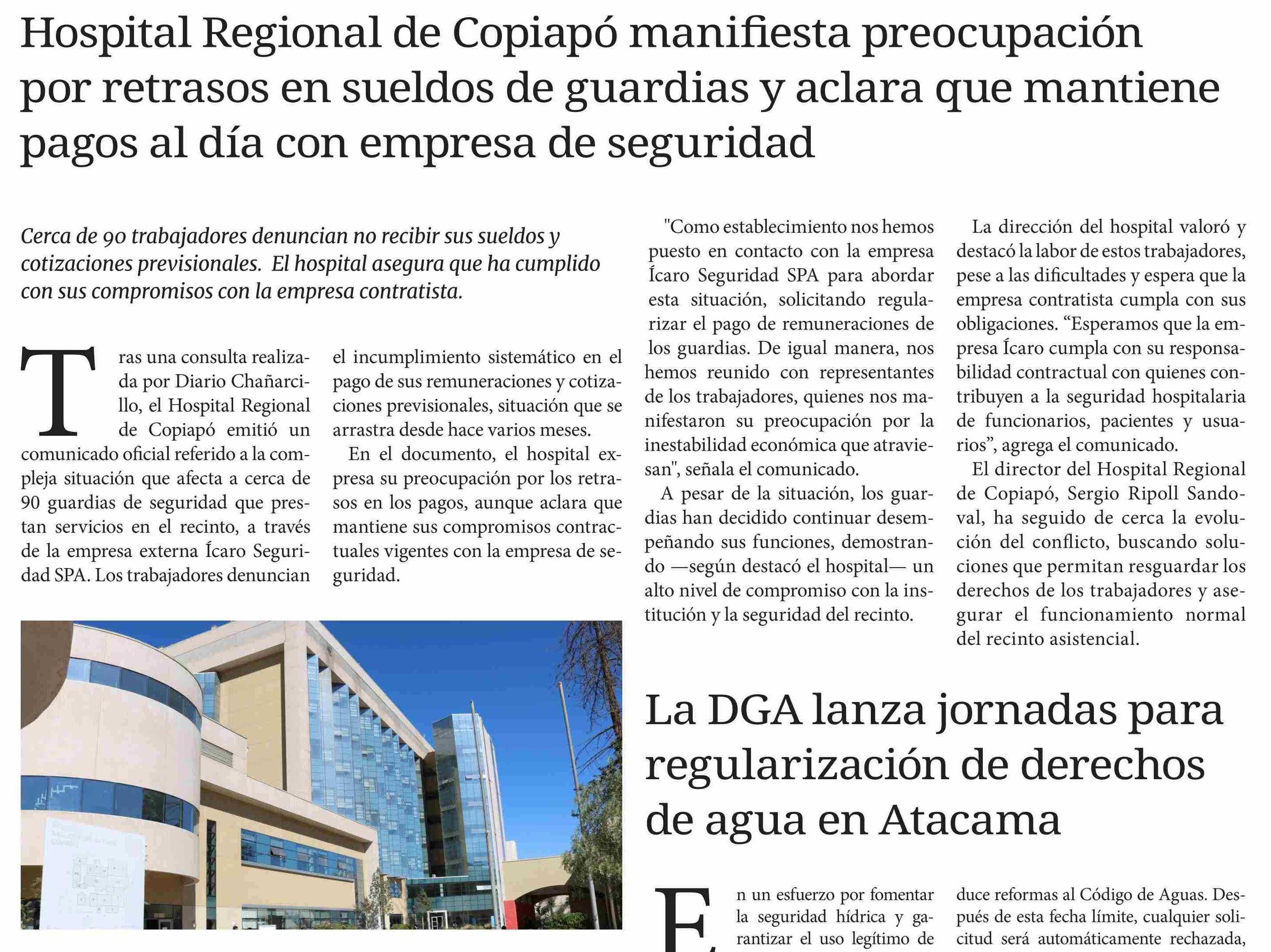 Título: Tras una consulta realizada por Diario Chañarcillo, el Hospital Regional de Copiapó emitió un comunicado oficial referido a la compleja situación que afecta a cerca de 90 guardias de seguridad que prestan servicios en el recinto, a través de la empresa externa Ícaro Seguridad SPA. Los trabajadores d