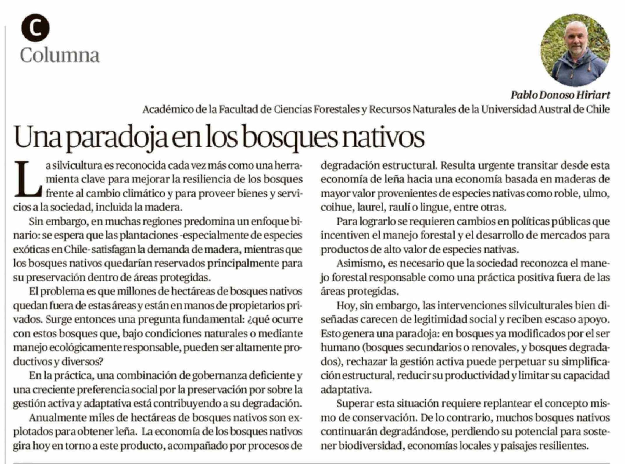 Columnas de Opinión: Una paradoja en los bosques nativos 09-04-2026 Diario Austral Región de Los Ríos |