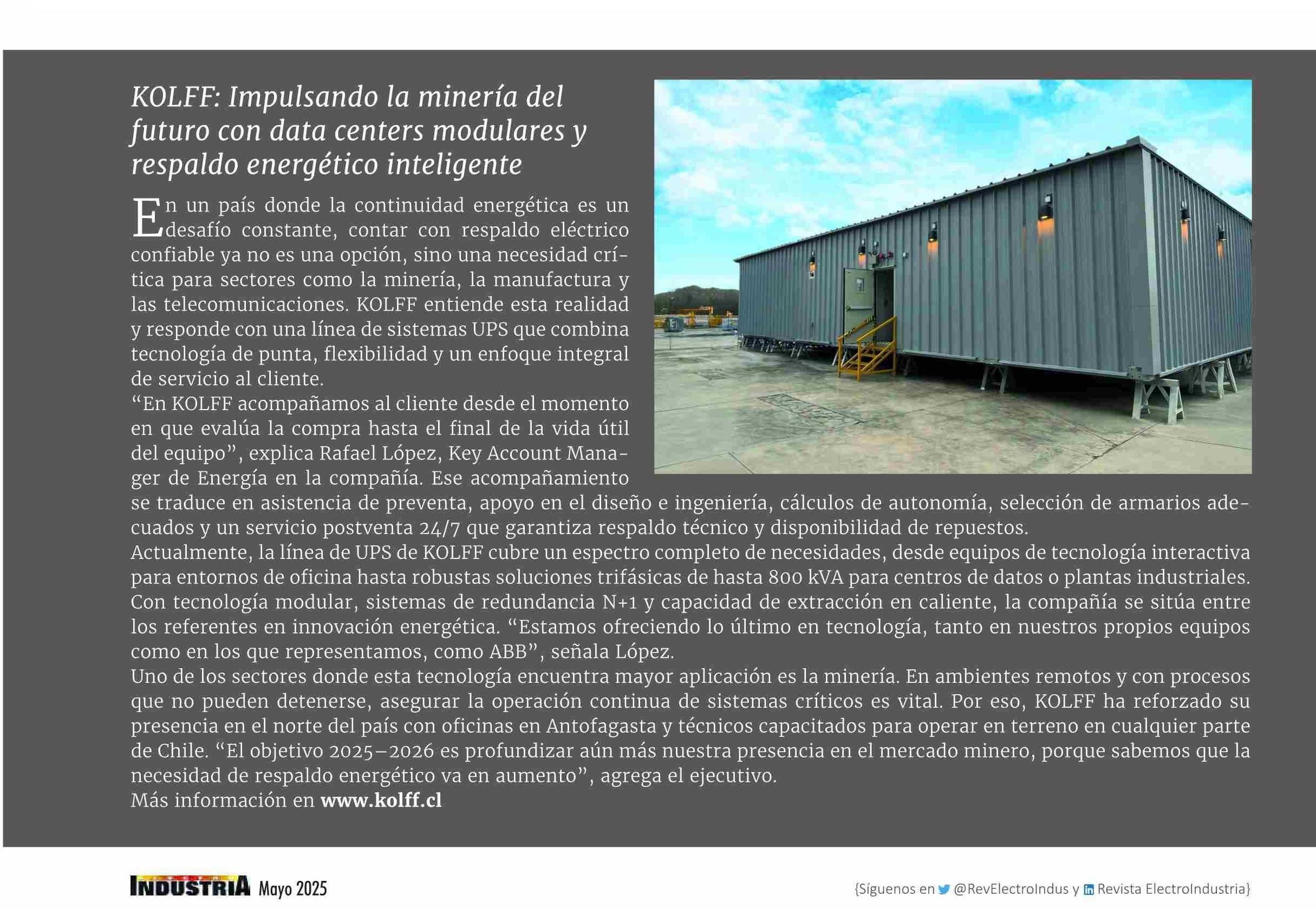 KOLFF: Impulsando la minería del futuro con data centers modulares y respaldo energético inteligente 29-05-2025 Revista Electro Industria |
