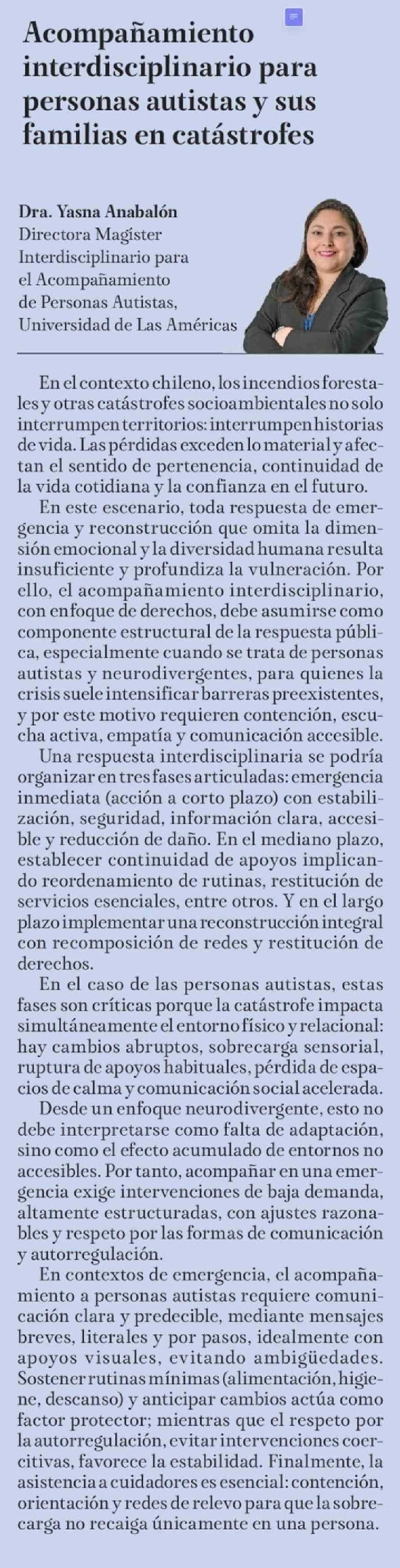 | Título: | Columnas de Opinión: Acompañamiento interdisciplinario para personas autistas y sus familias en catástrofes |
