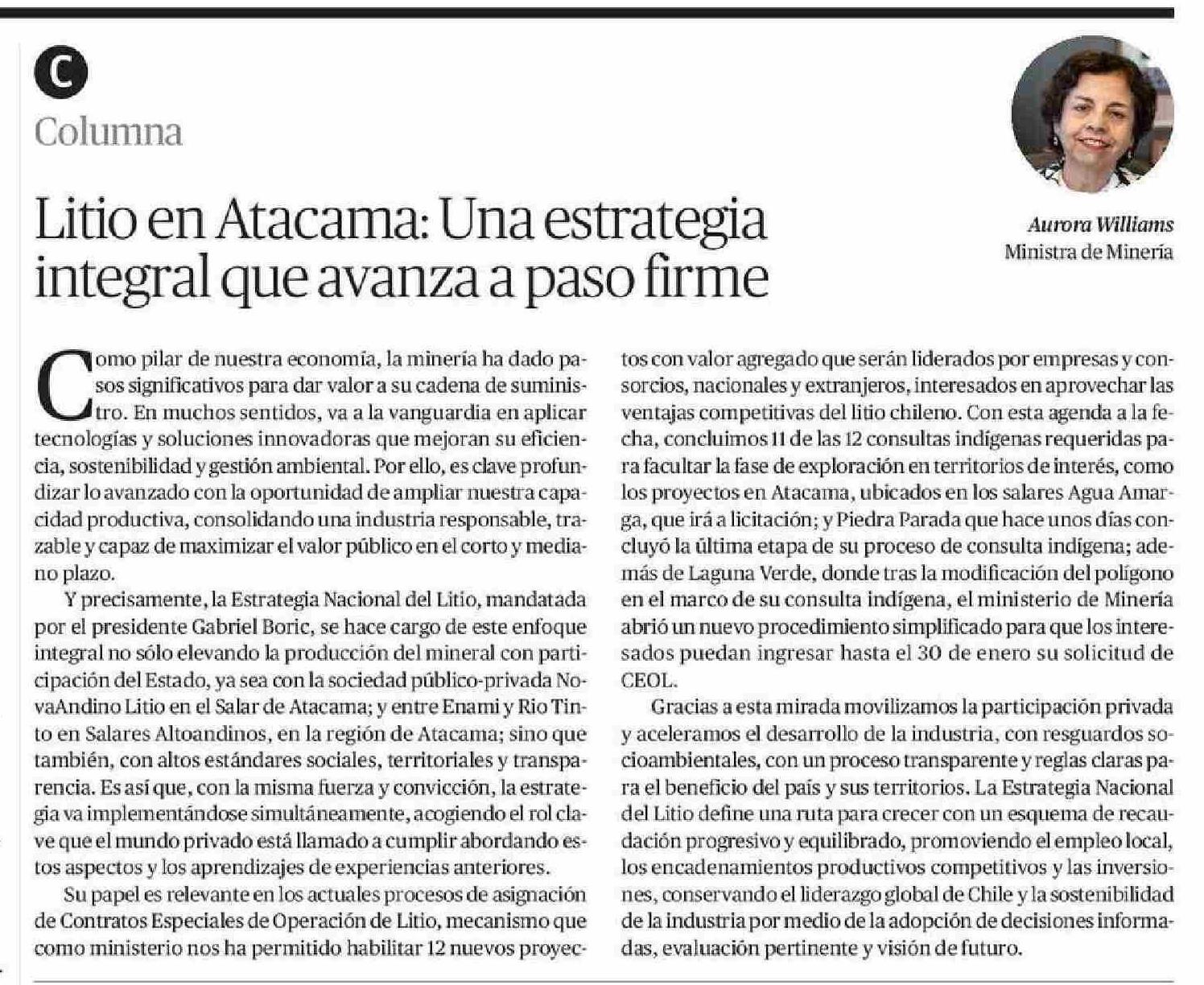 Columnas de Opinión: Litio en Atacama: Una estrategia integral que avanza a paso firme 19-01-2026 El Diario de Atacama |