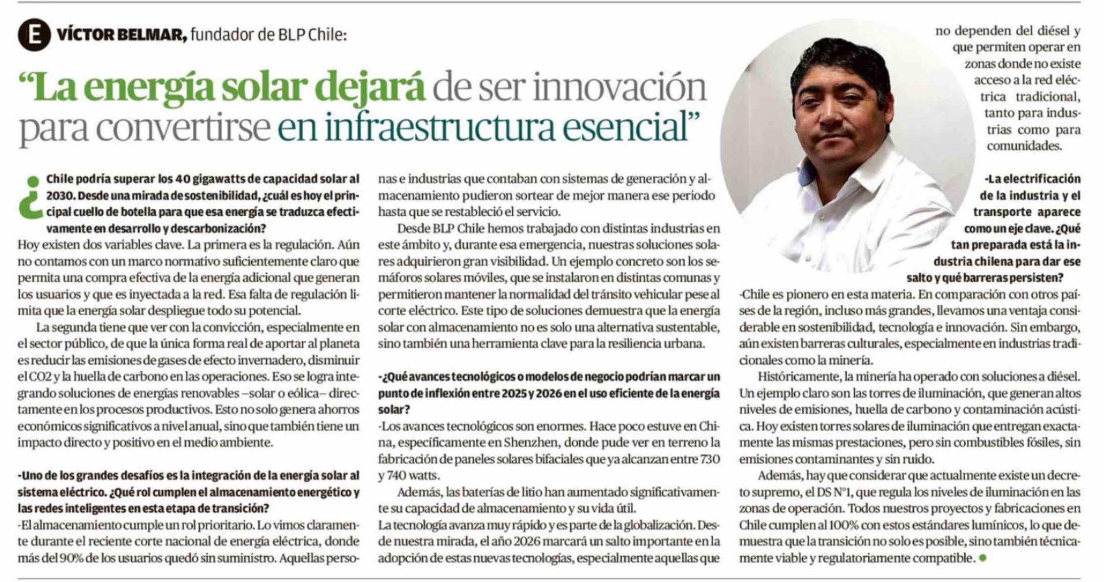 Columnas de Opinión: "La energía solar dejará de ser innovación para convertirse en infraestructura esencial" 15-02-2026 El Austral de la Araucanía |