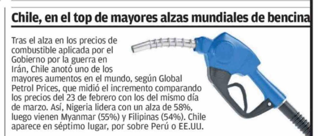 Chile, en el top de mayores alzas mundiales de bencina 29-03-2026 Diario Austral Región de Los Ríos |