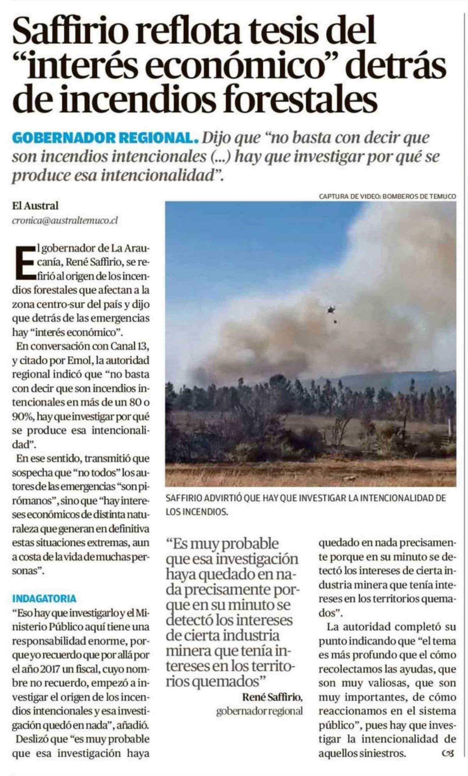 Título: Saffirio reflota tesis del "interés económico" detrás de incendios forestales