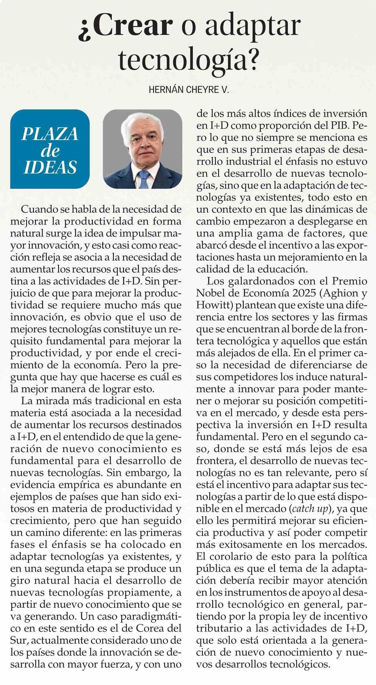 Columnas de Opinión: ¿Crear o adaptar tecnología? 06-03-2026 El Mercurio |