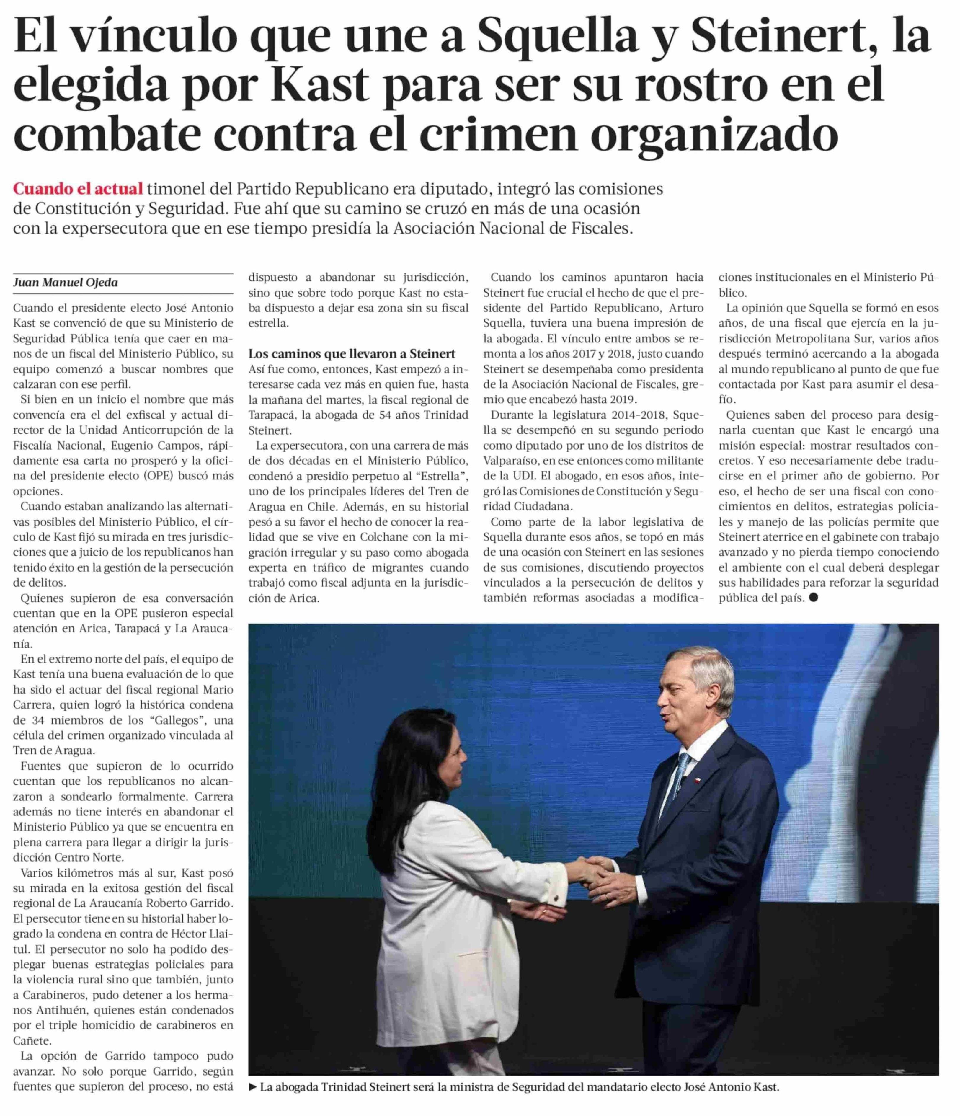 El vínculo que une a Squella y Steinert, la elegida por Kast para ser su rostro en el combate contra el crimen organizado 22-01-2026 La Tercera |