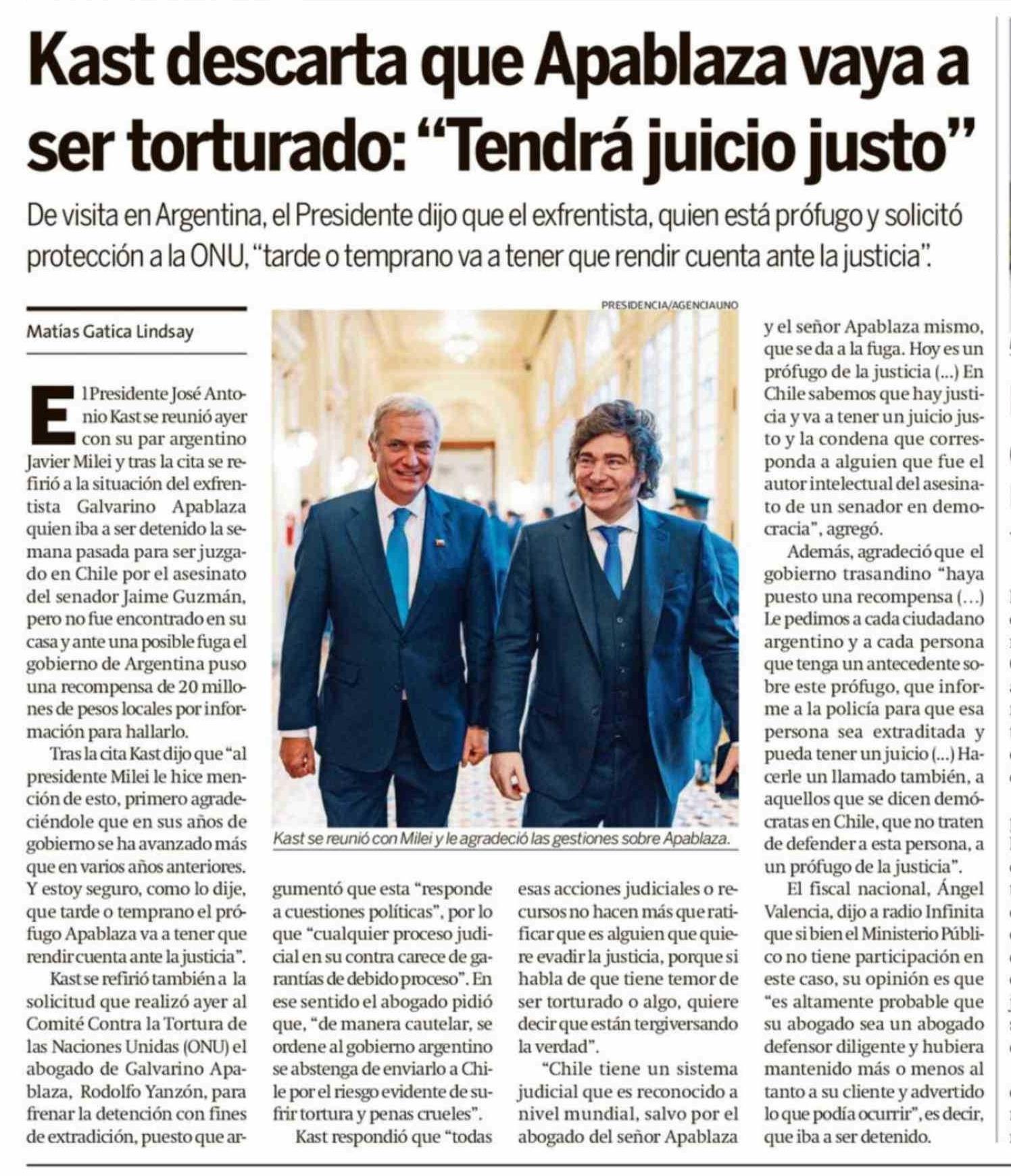 Título: Kast descarta que Apablaza vaya a ser torturado: "Tendrá juicio justo"